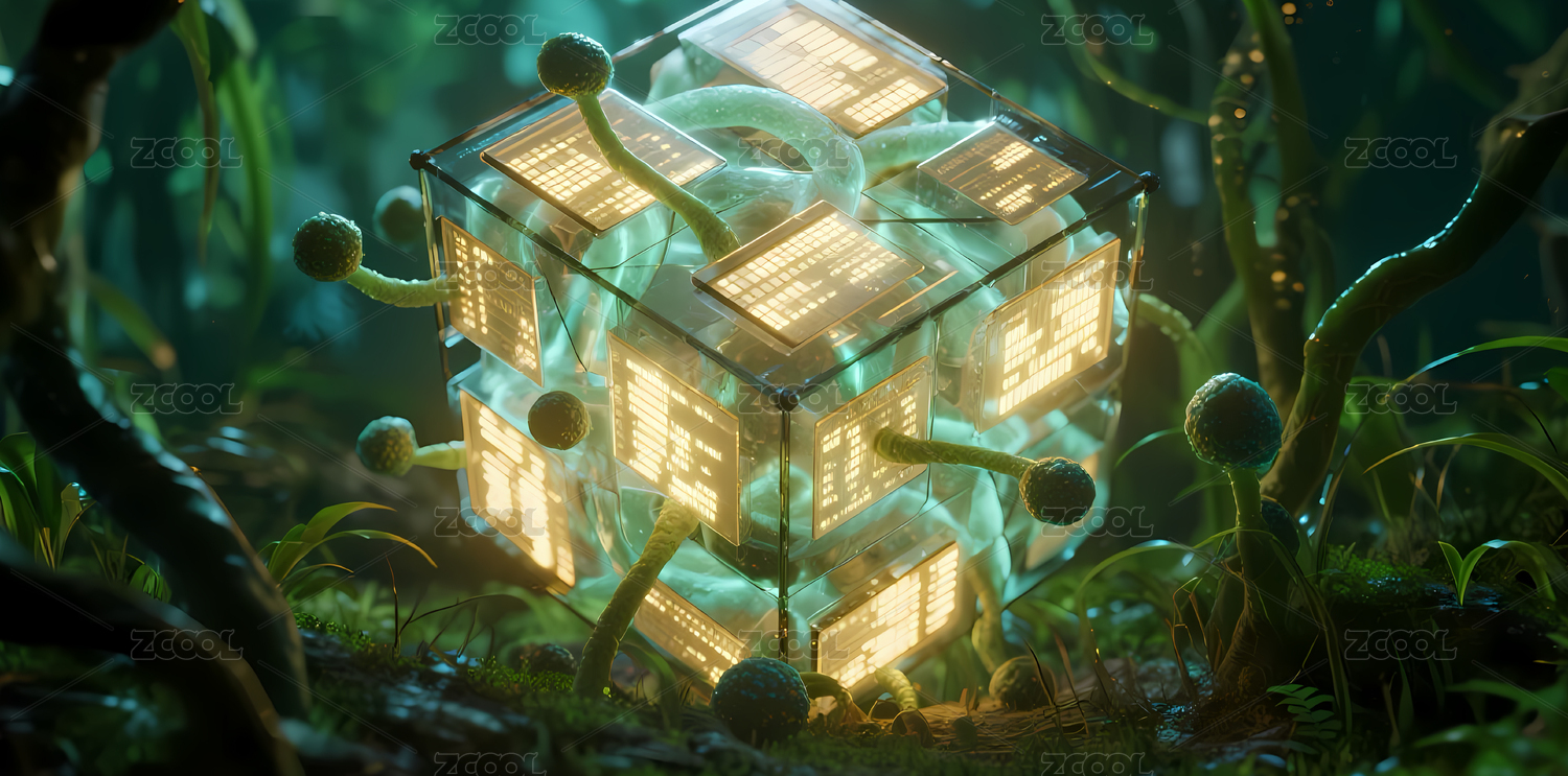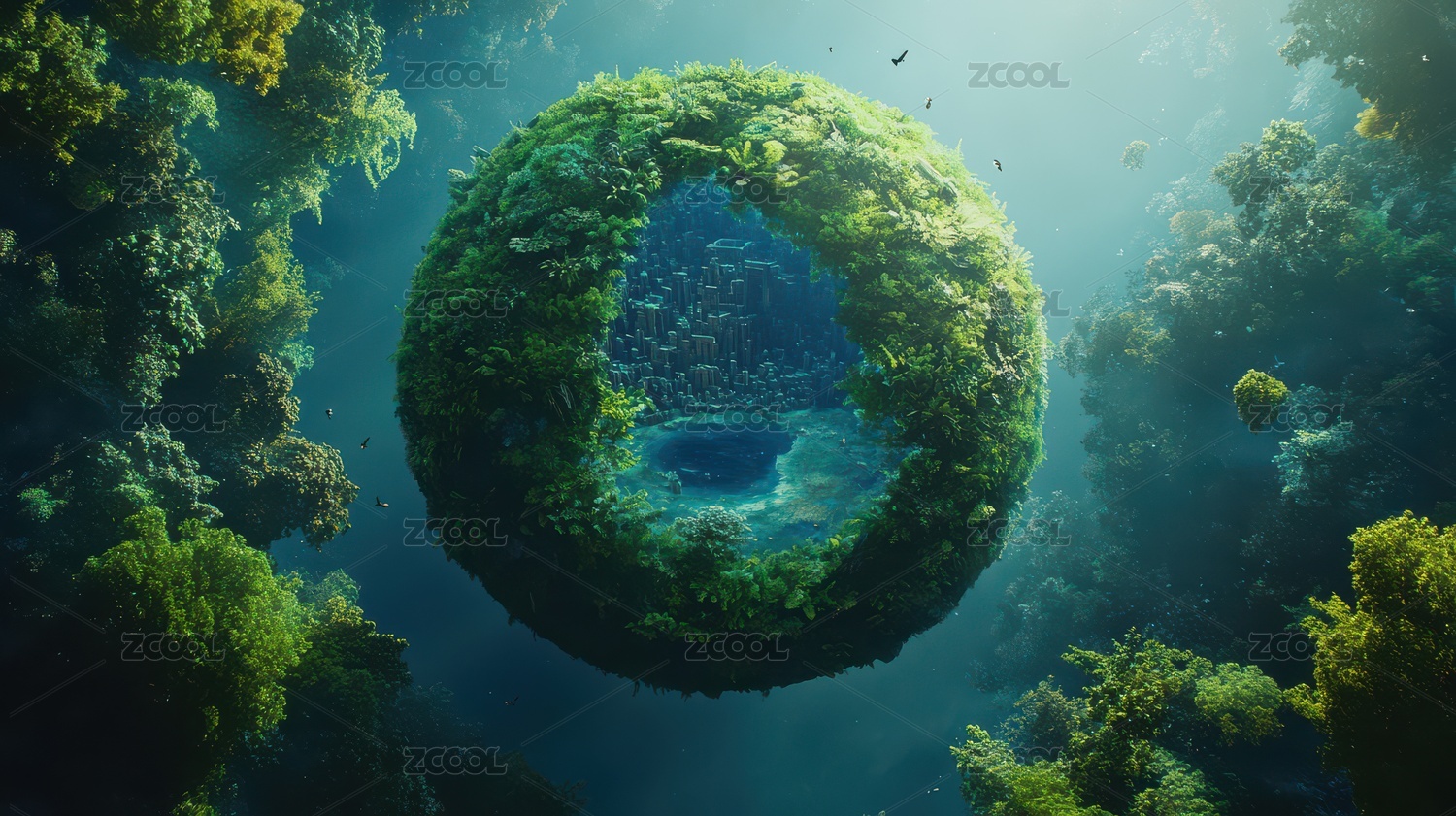 淡绿色色调的远山风景里有蓝色的几何体方块