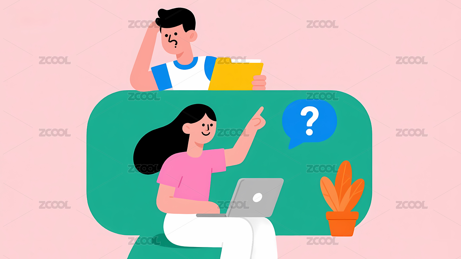 在线提出问题的疑问困惑的女生插画
