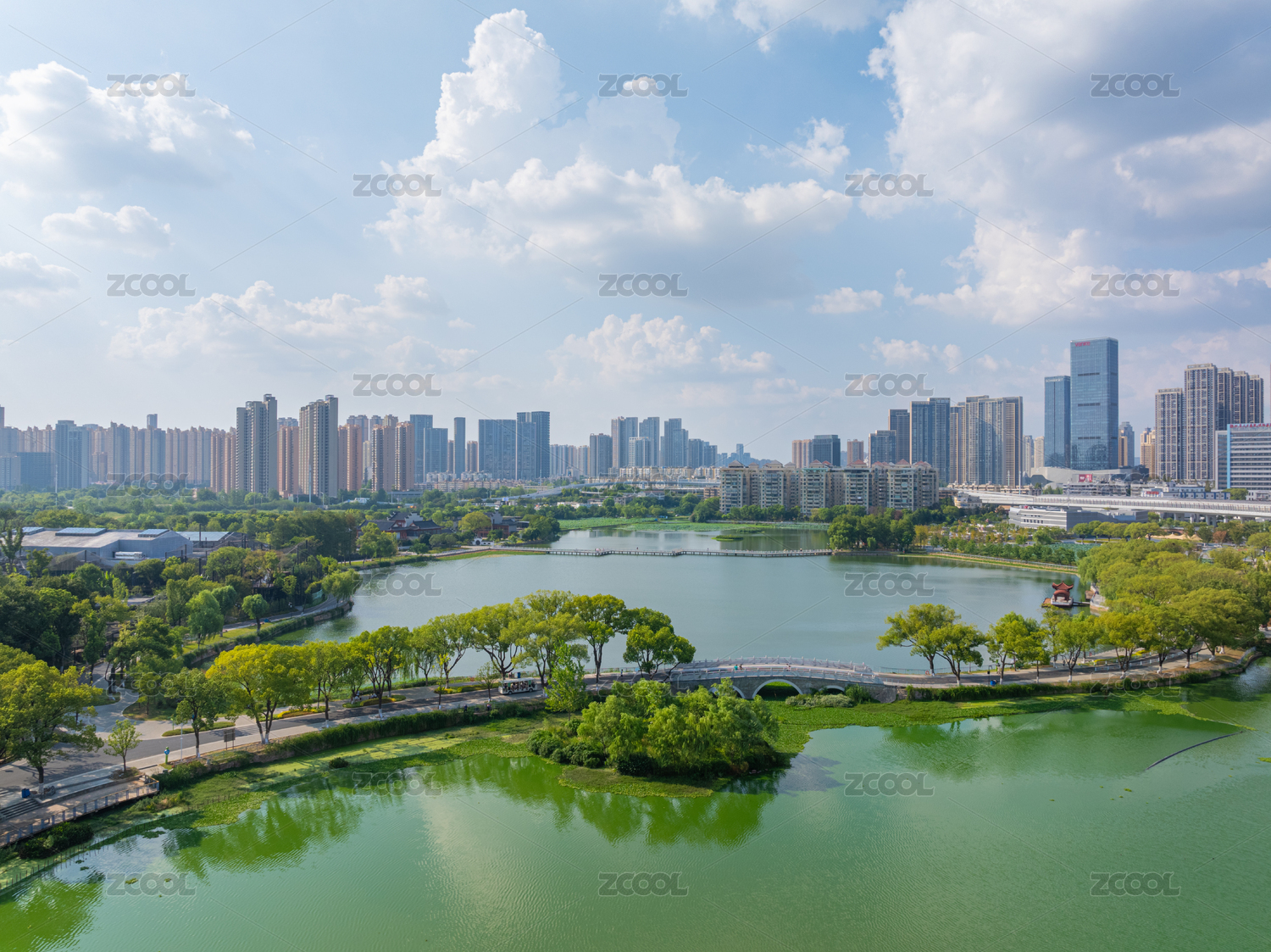 夏季白天航拍武汉沙湖公园城市天际线风光