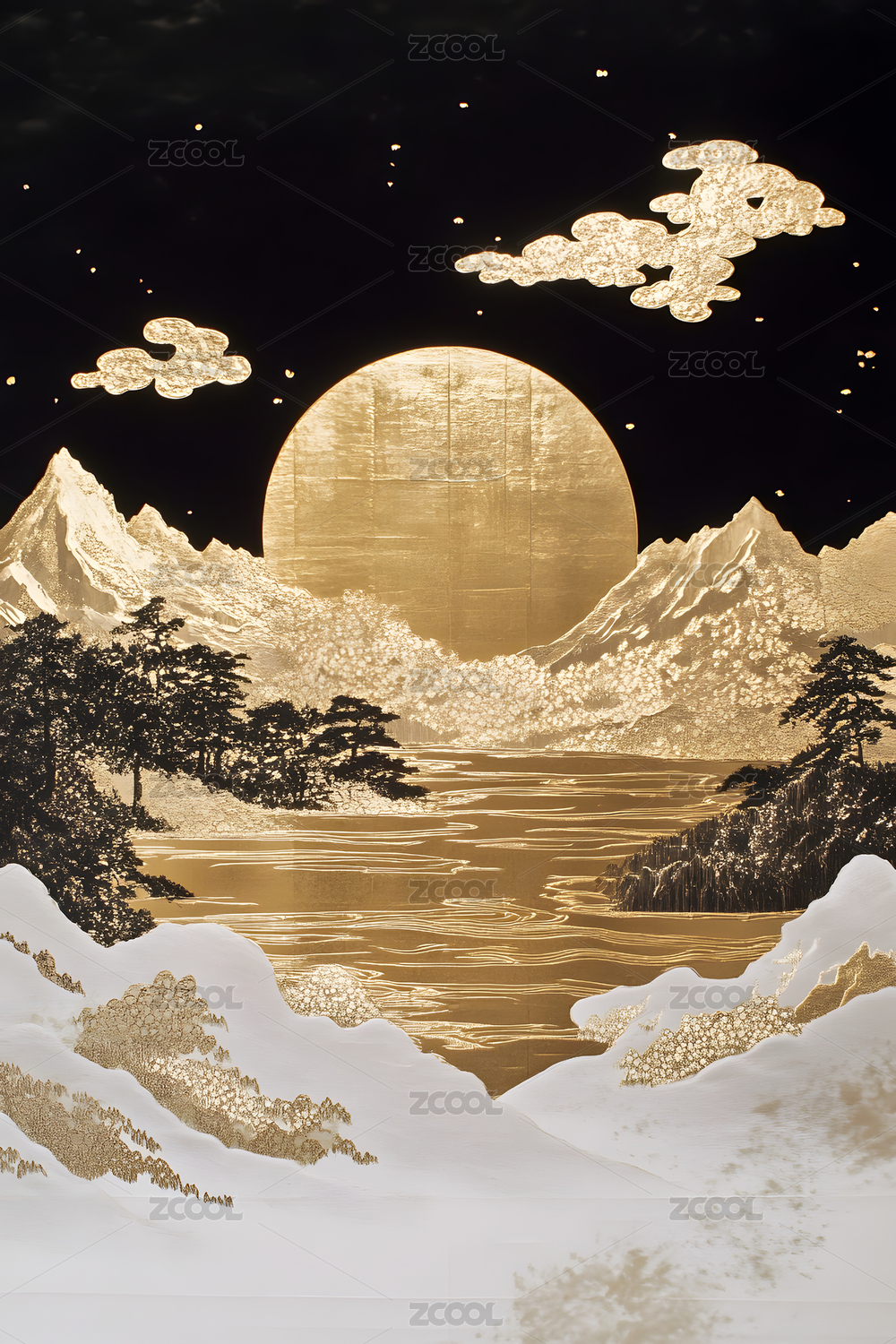 金箔祥云飞鸟山间溪流