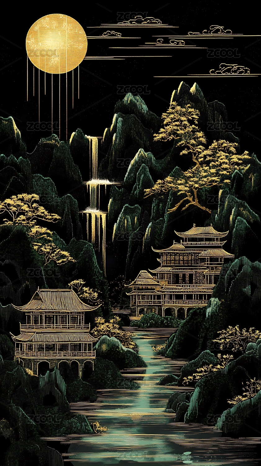水墨山水画卷夜色瀑布