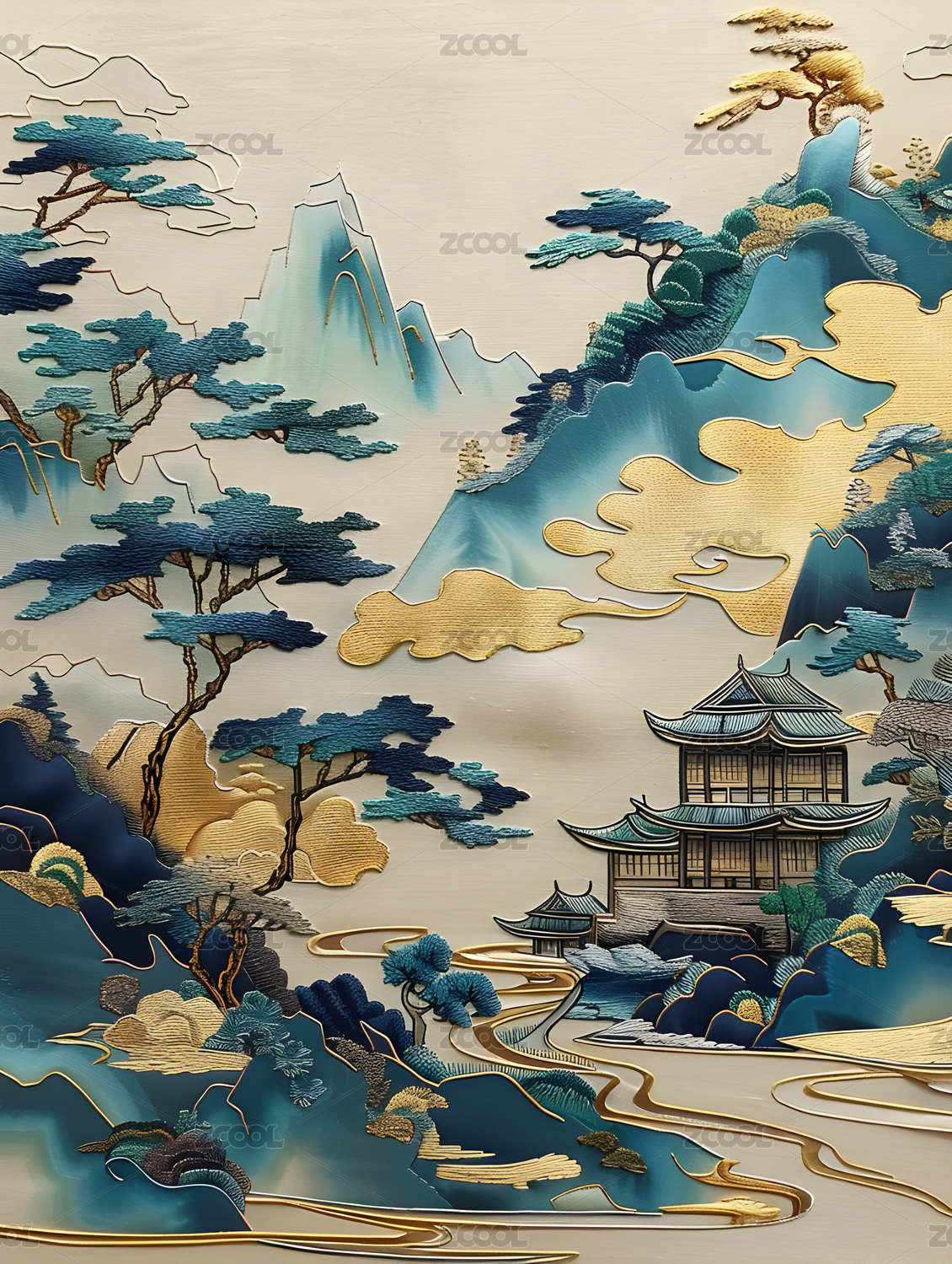 鎏金刺绣高端山水风景