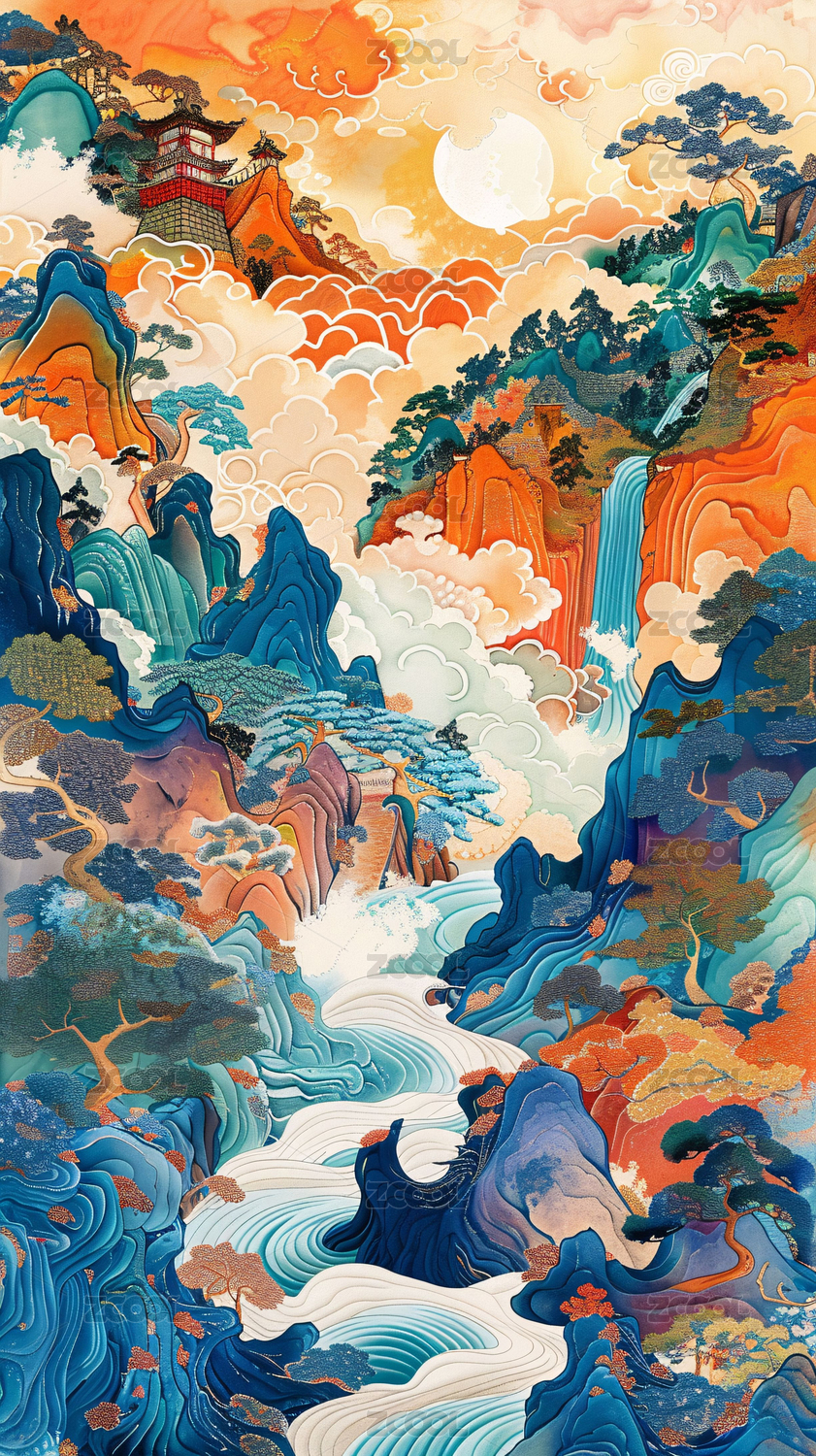 彩色传统山水风景插画海报背景