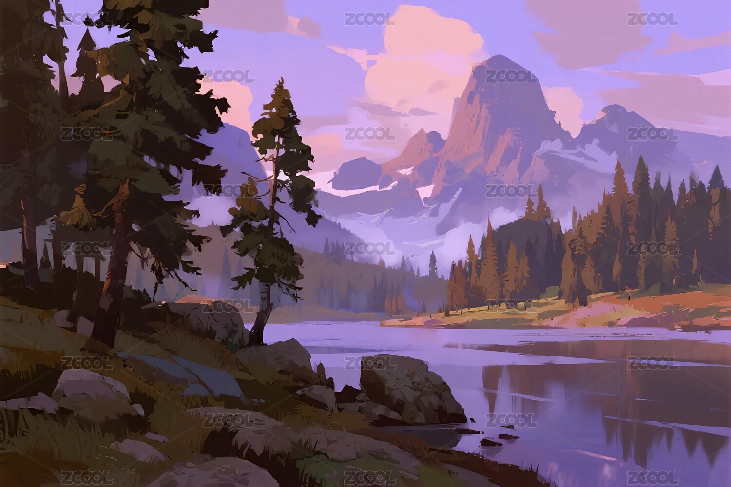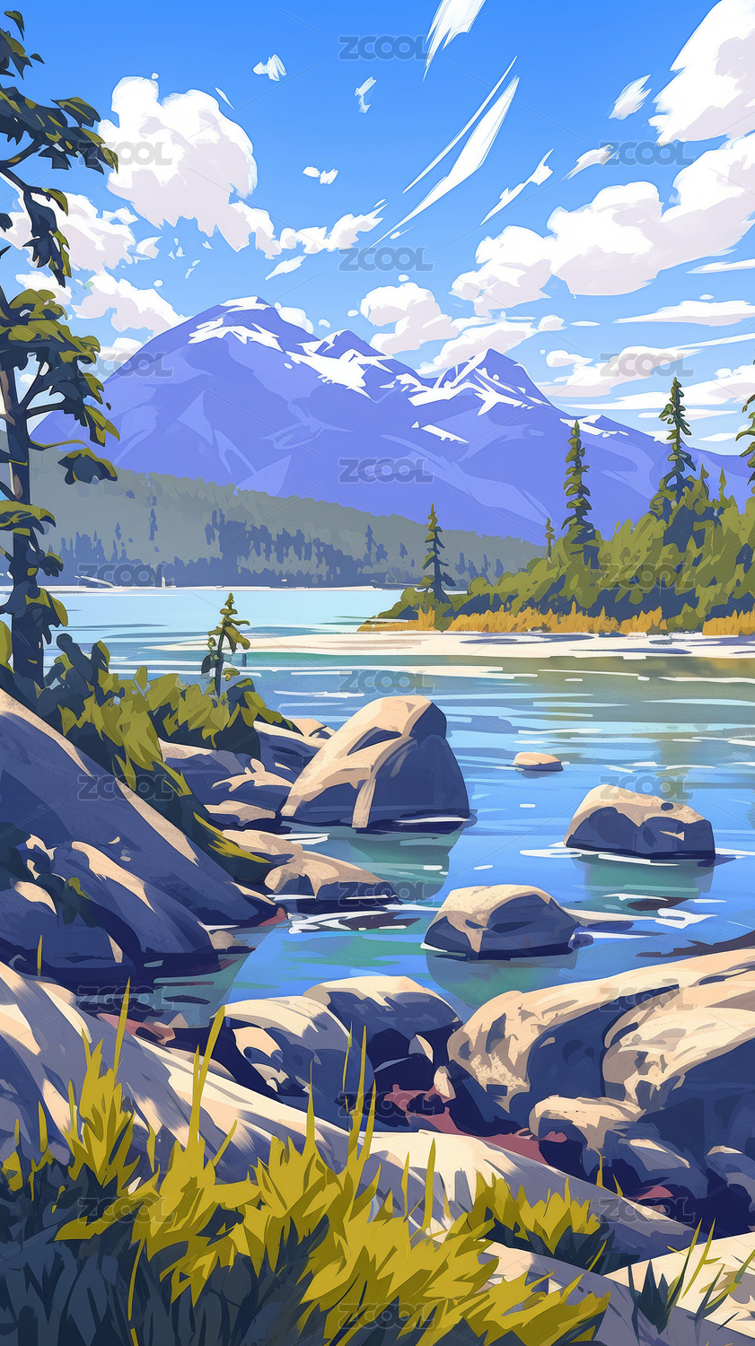 山间湖泊风景插画