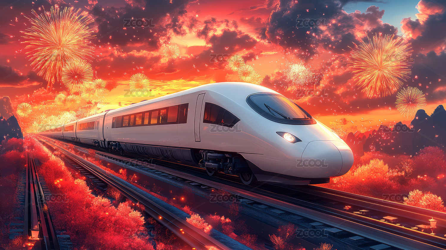 国风喜庆烟花绽放背景下中国高铁列车春运