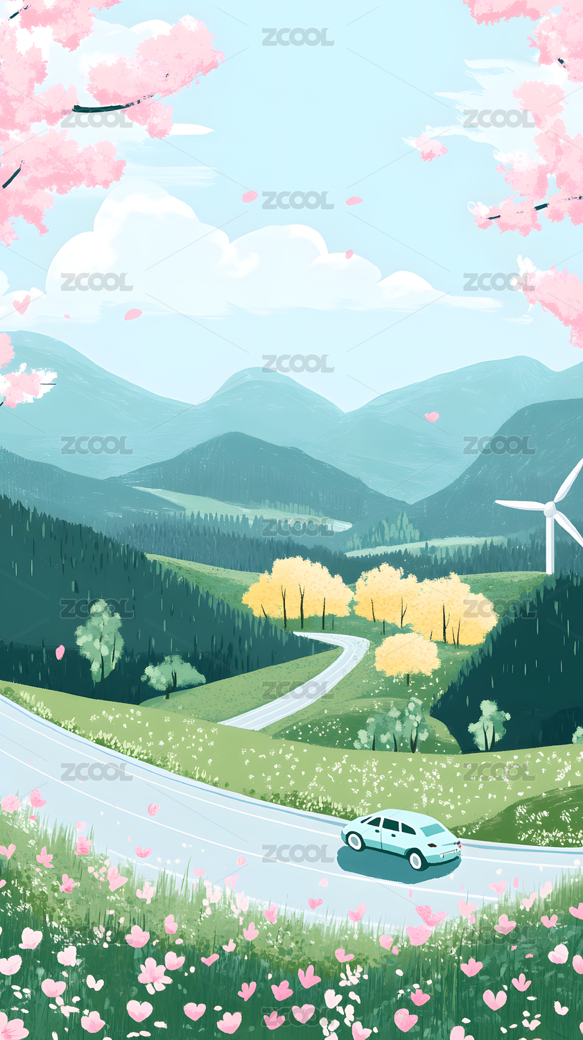 卡通小车行驶在春日田园