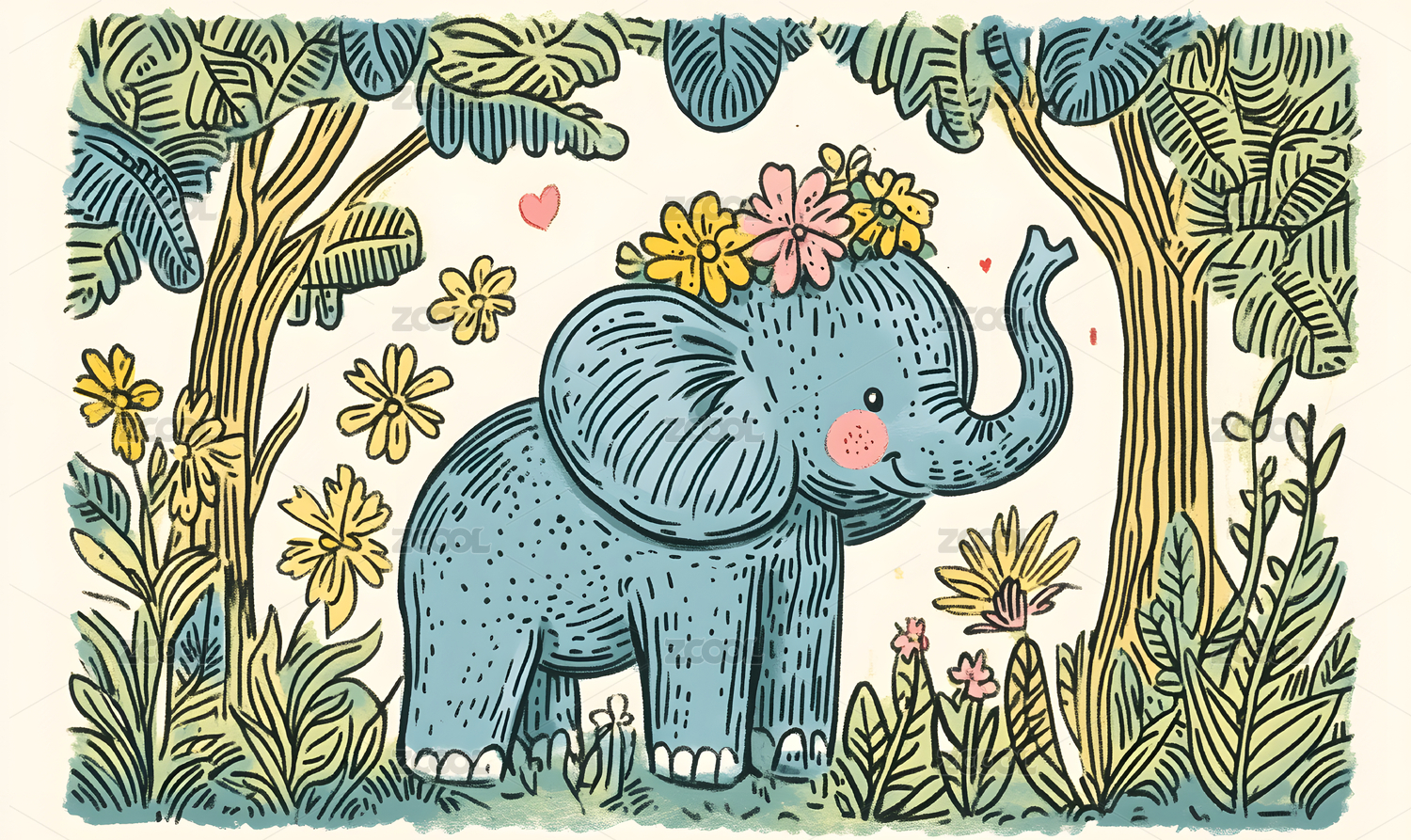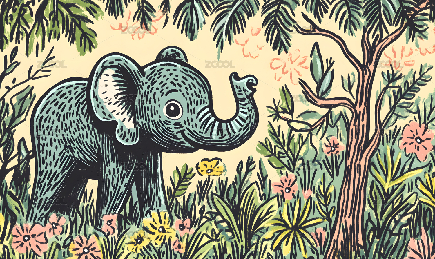 卡通,动物,可爱,手绘,插画,童趣,小象,大象,丛林,热带