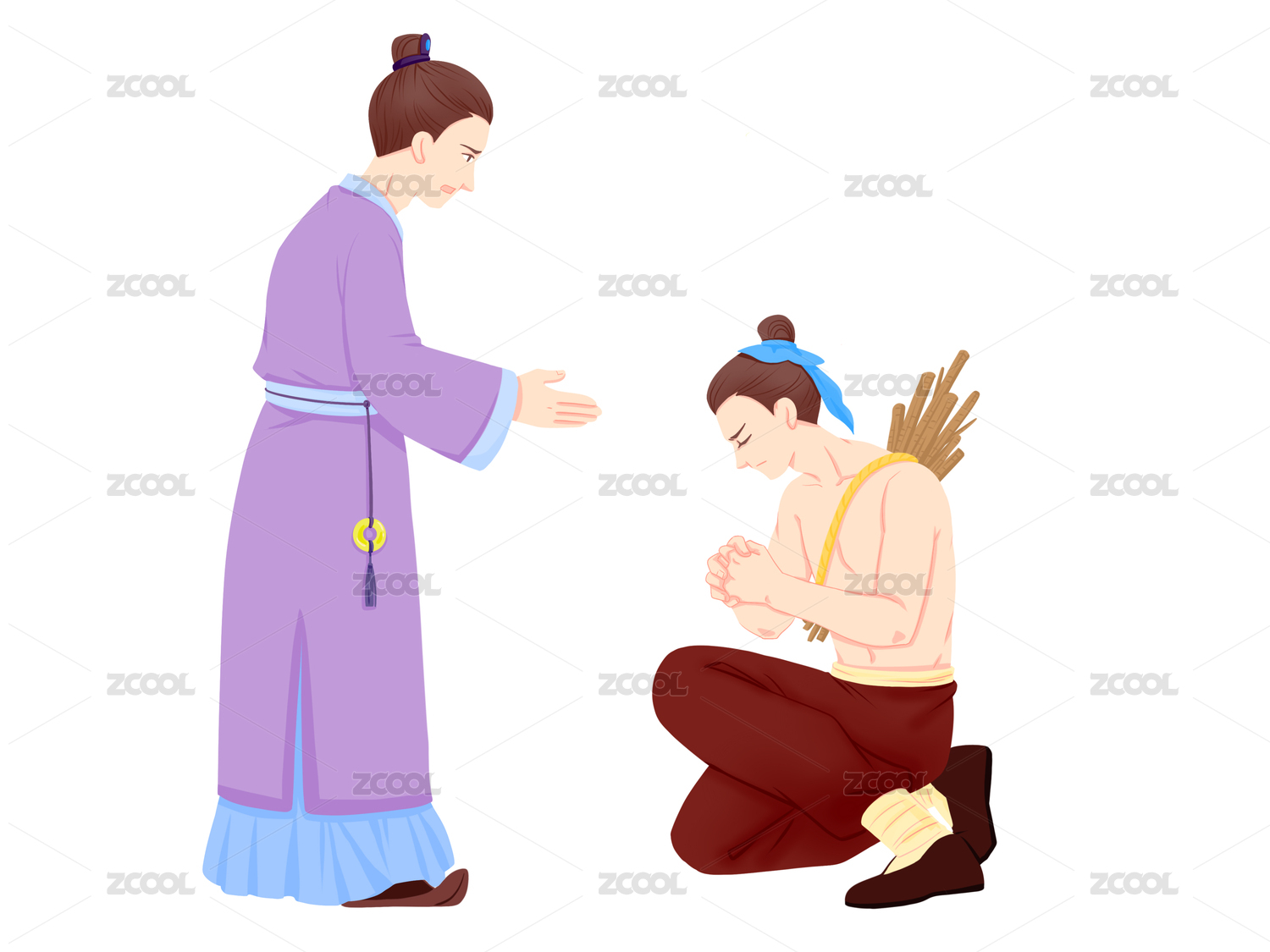 成语故事负荆请罪古装人物肩背木柴跪地谢