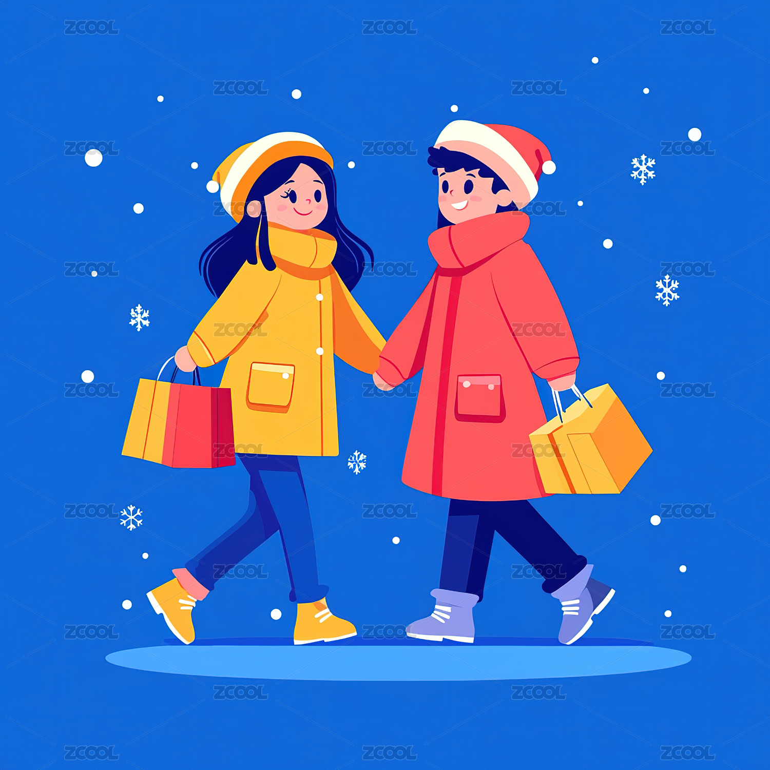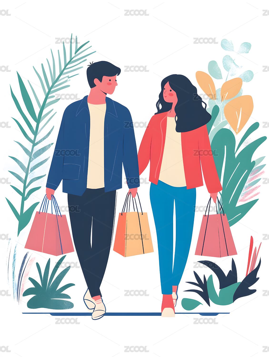 一对拿着礼物和购物袋的情侣时尚扁平插画