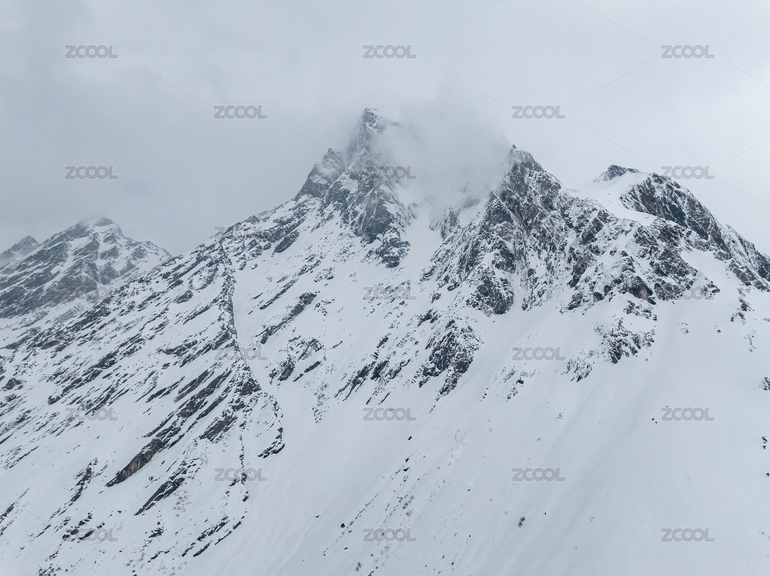 俯拍中国新疆喀什地区云雾缭绕的雪山风景