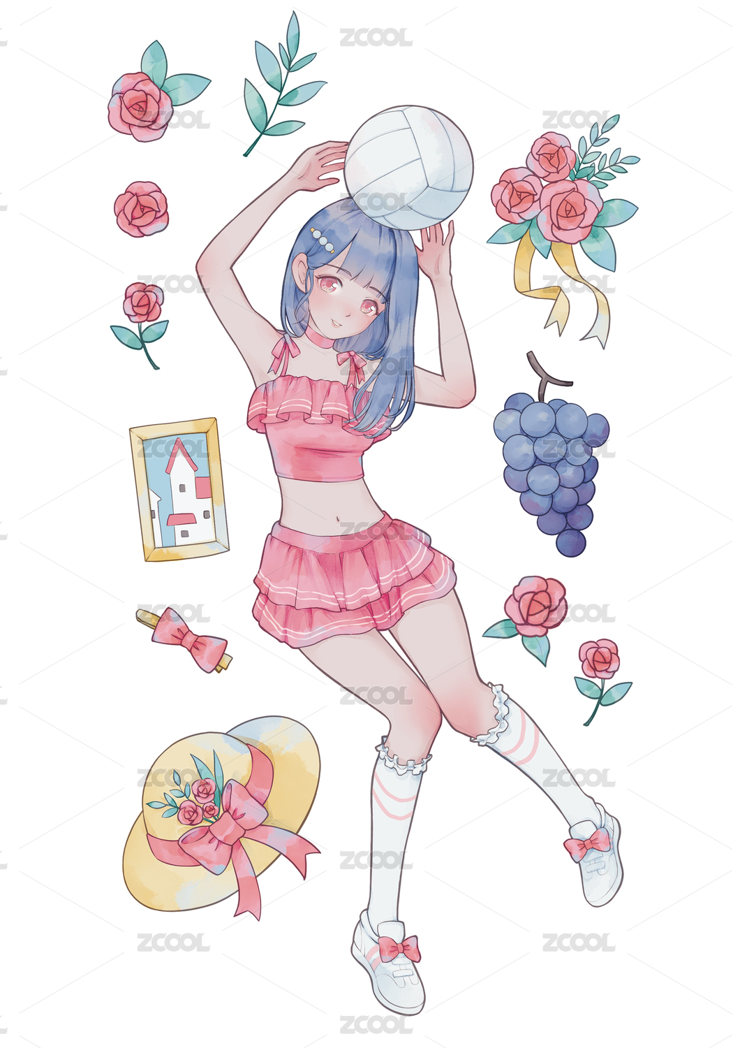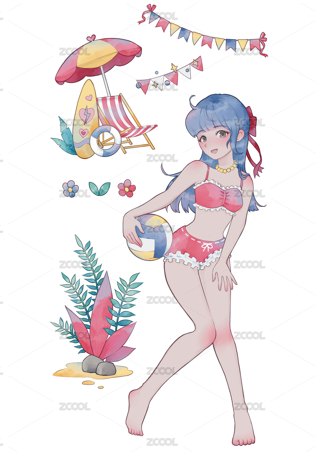 可爱二次元鲜花排球泳池派对泳装少女插画