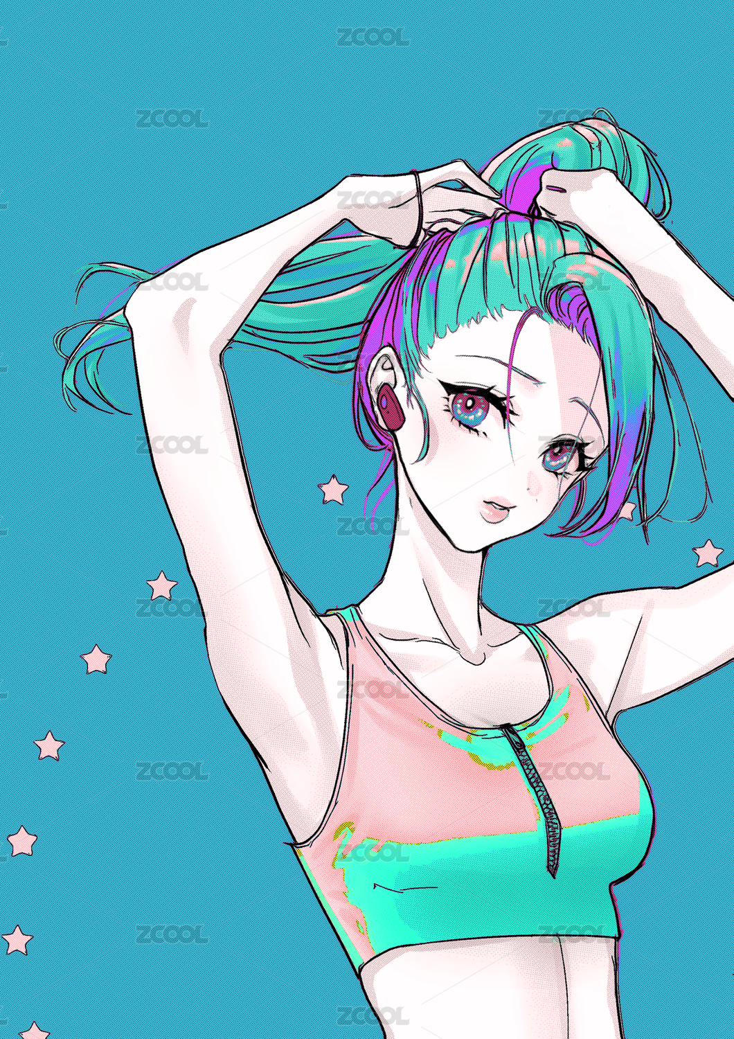 二次元紫瞳少女粉色蓝色渐变连衣裙