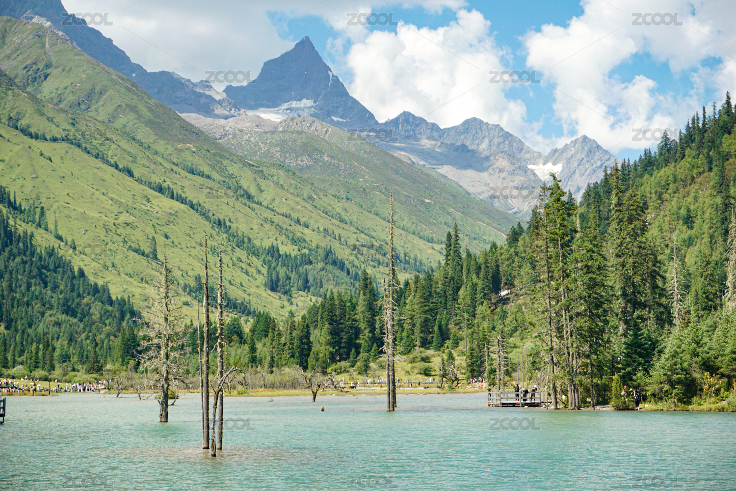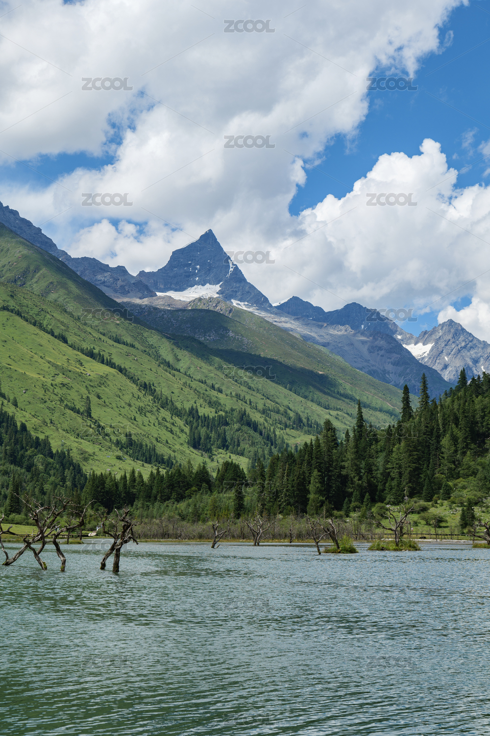 中国川西夏季翠绿的四姑娘山景区雪山及湖泊
