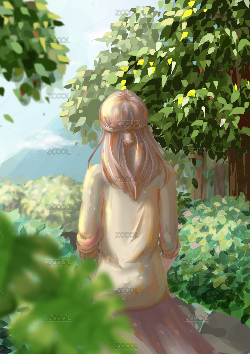 女孩森林草地奔跑蝴蝶清新治愈风景插画