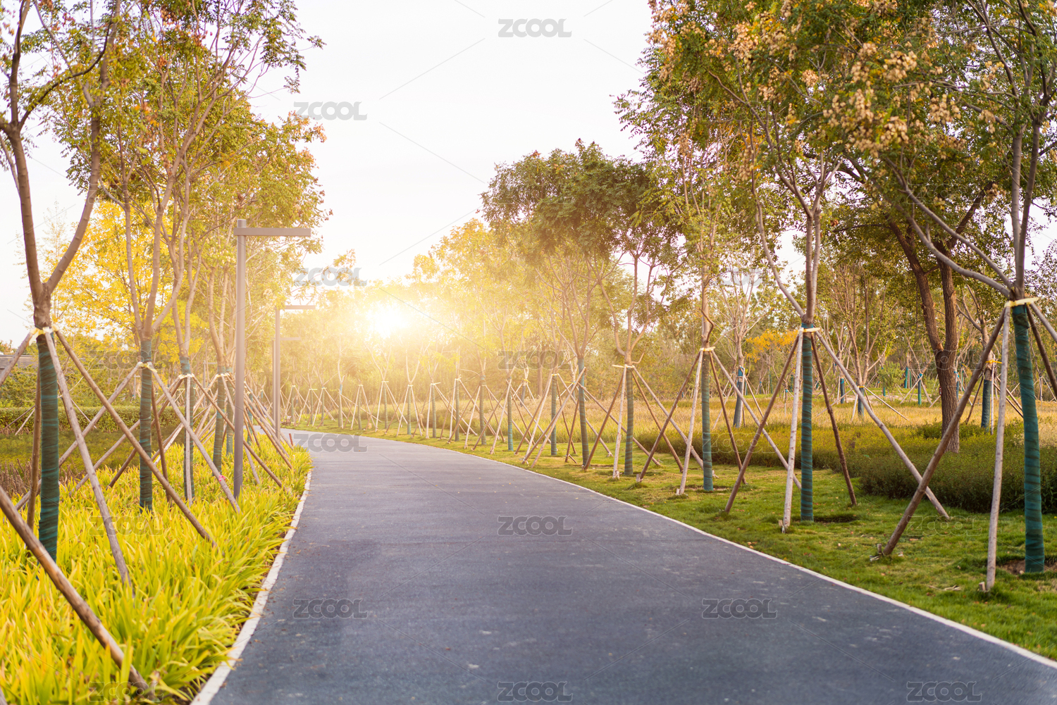 阳光照射下的公园步道和草地