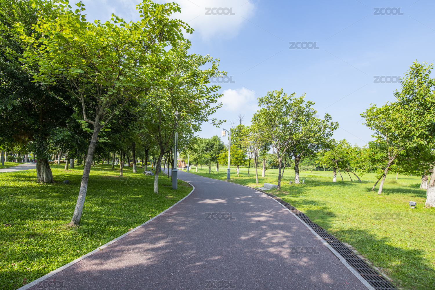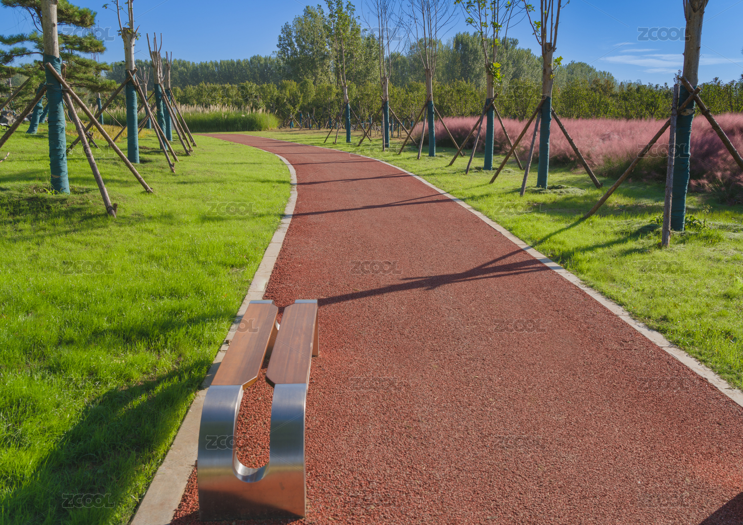 清晨蓝天下城市公园里的休闲健身步道
