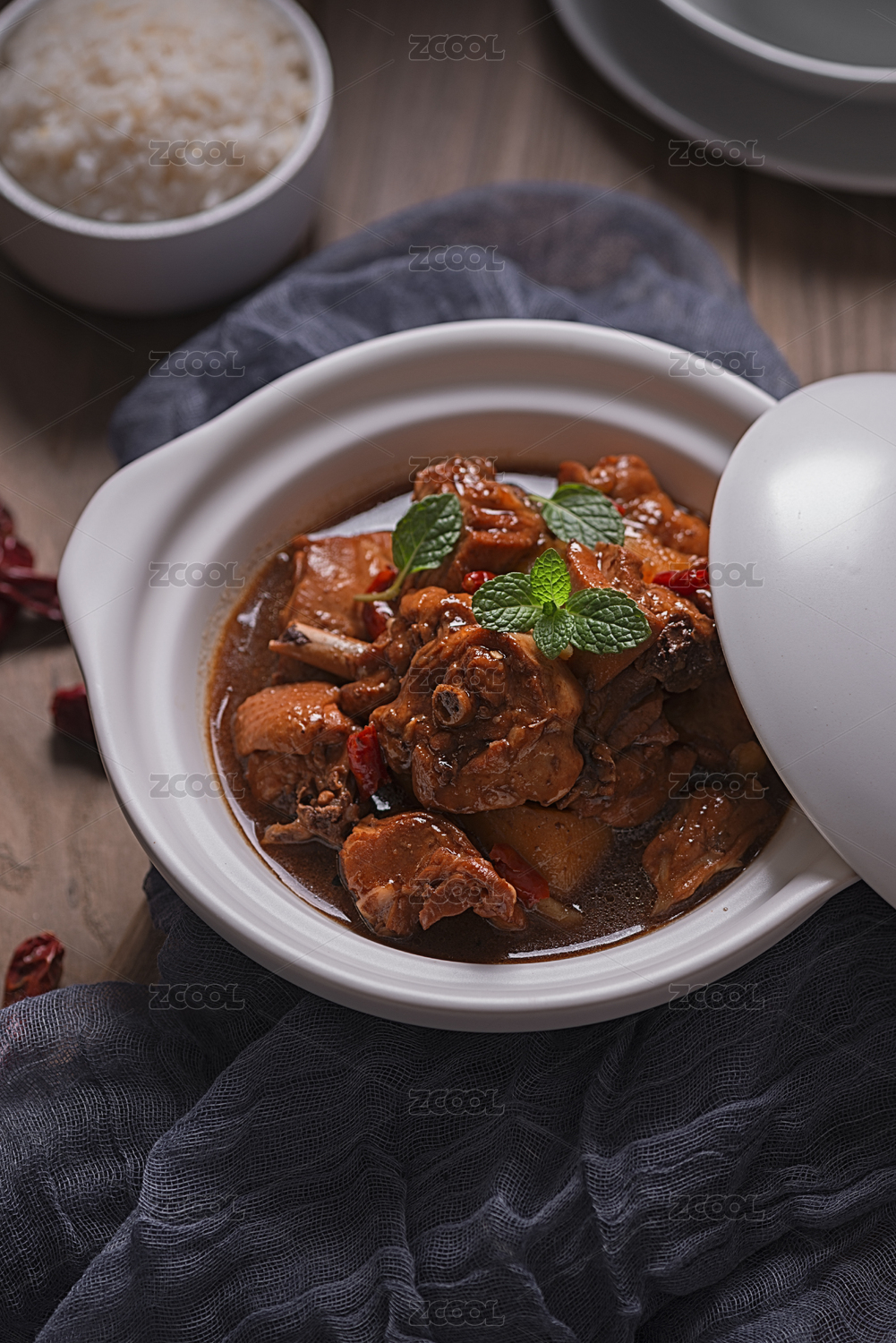 原木质感的桌面上白色砂锅盛着大块的黄焖鸡