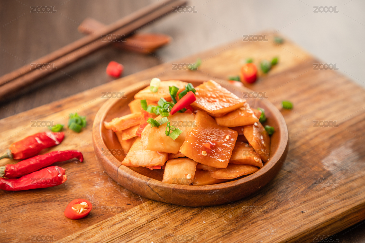 棕色木纹板上放着一碗辣萝卜干
