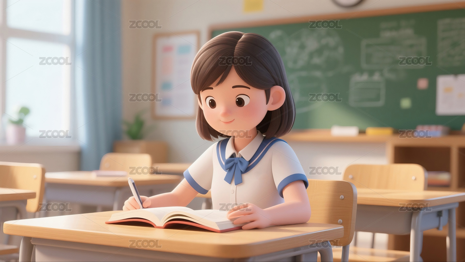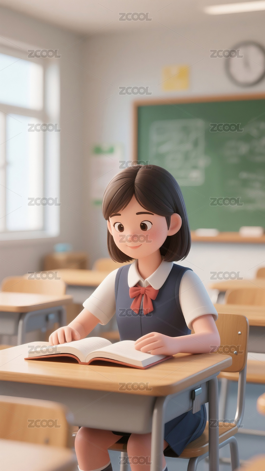 一个坐在课桌前思考的女孩3d插画