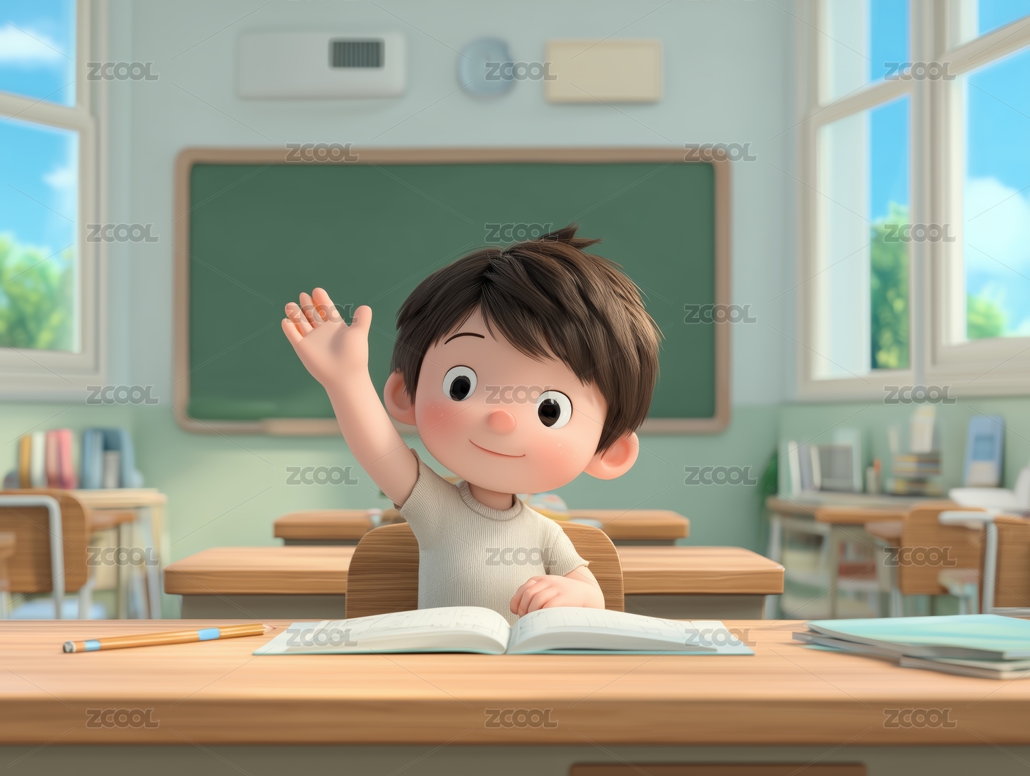 一个小女生坐在课桌前举手上课3D插画