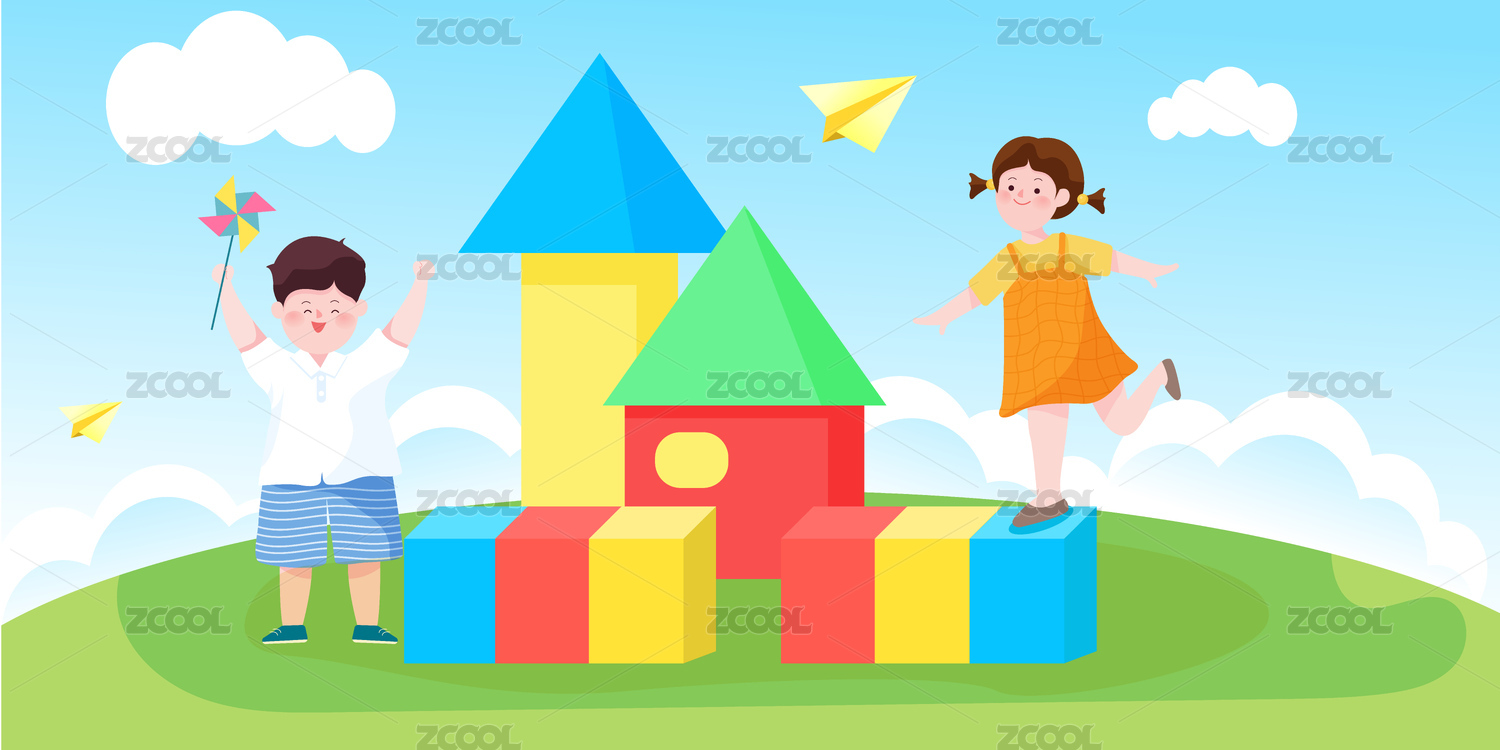 卡通儿童暑假游乐场城堡滑滑梯玩耍教育插画