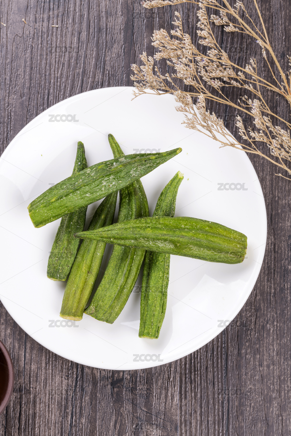 桌面上的盘子里的美味可口的秋葵干