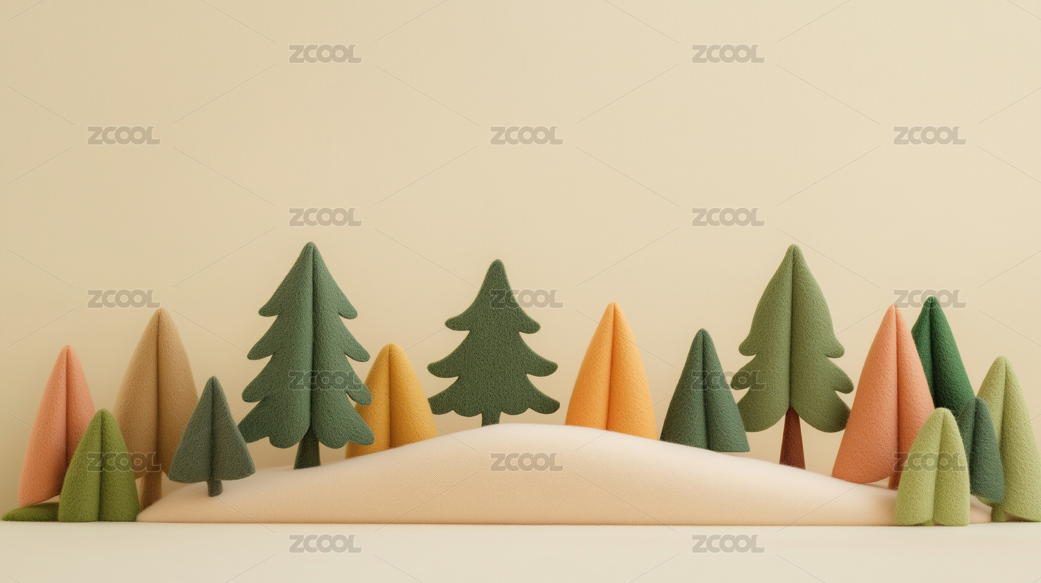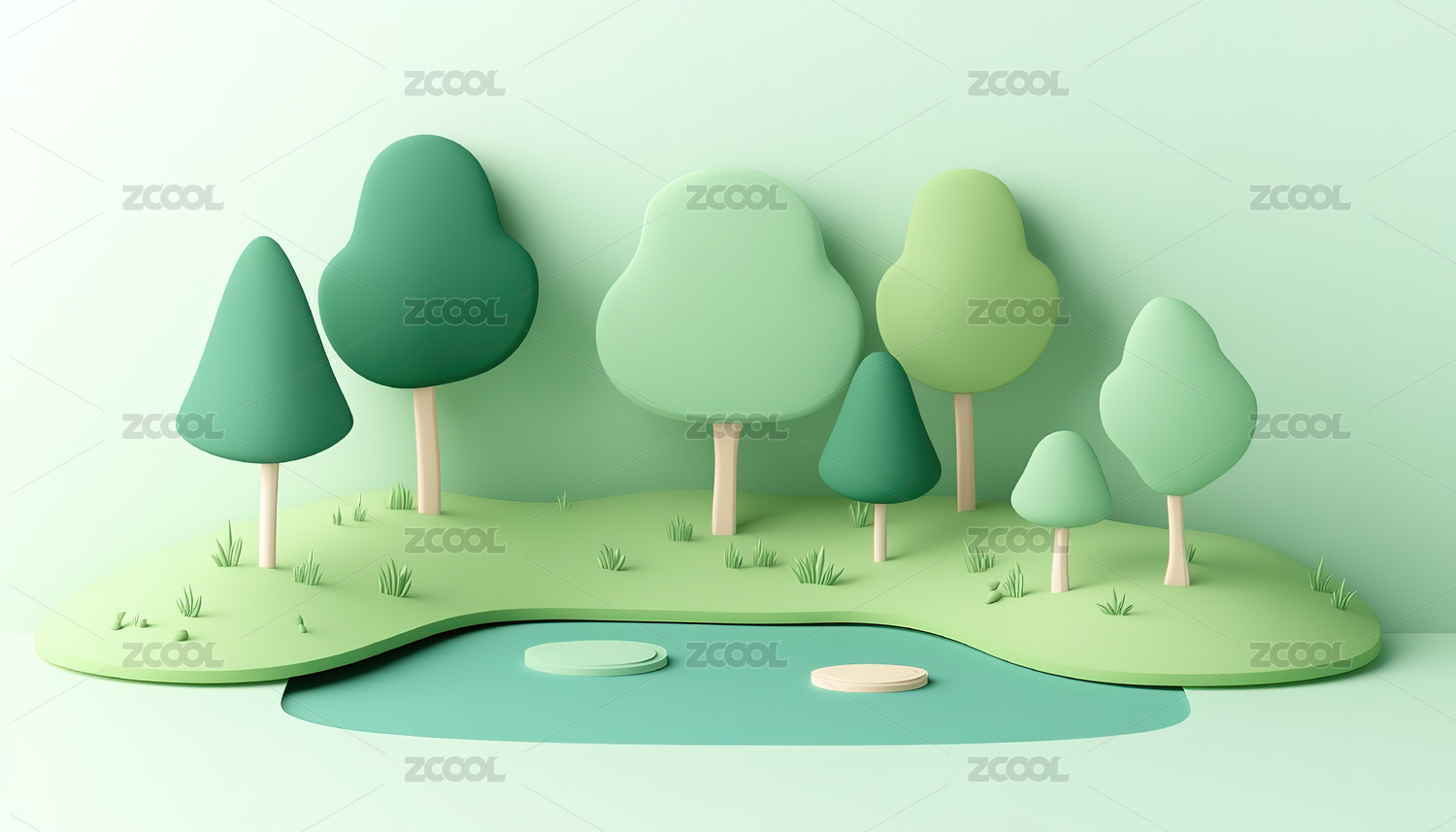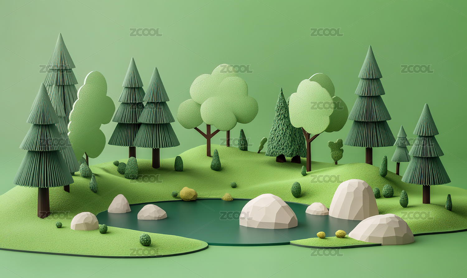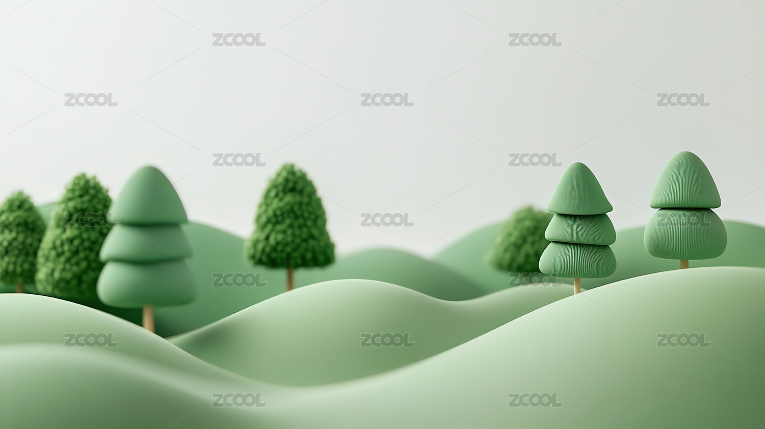 树木,山丘,绿色,卡通,可爱,3D渲染,插画,场景,自然,清新