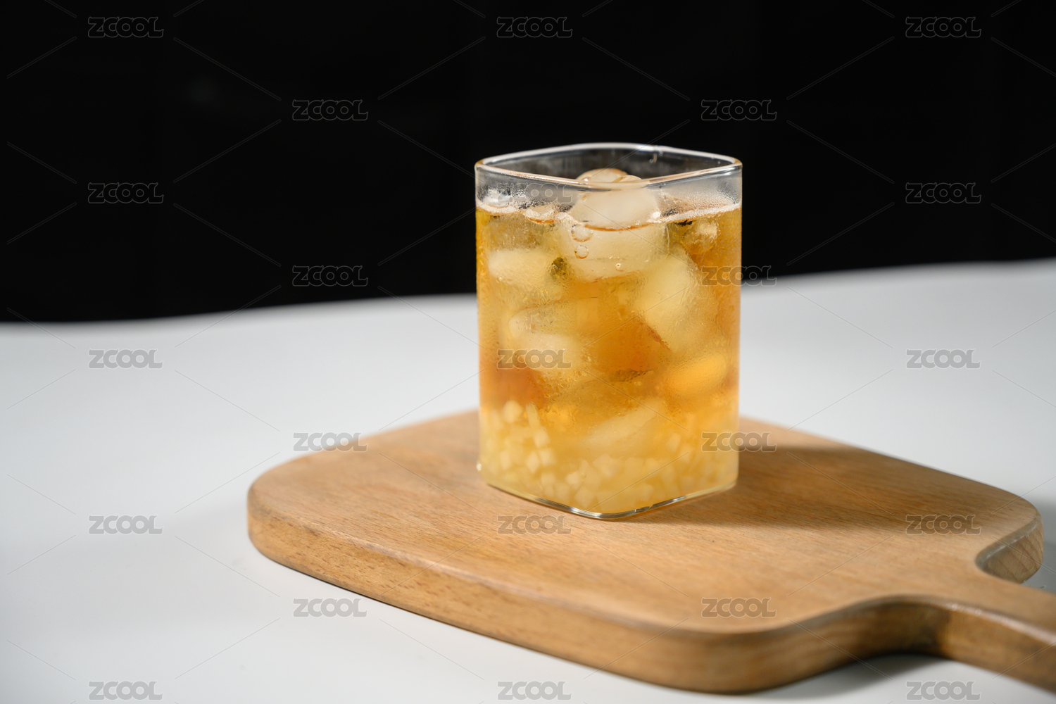 桌面上的杯子里的甘甜可口的冰咖啡果皮茶