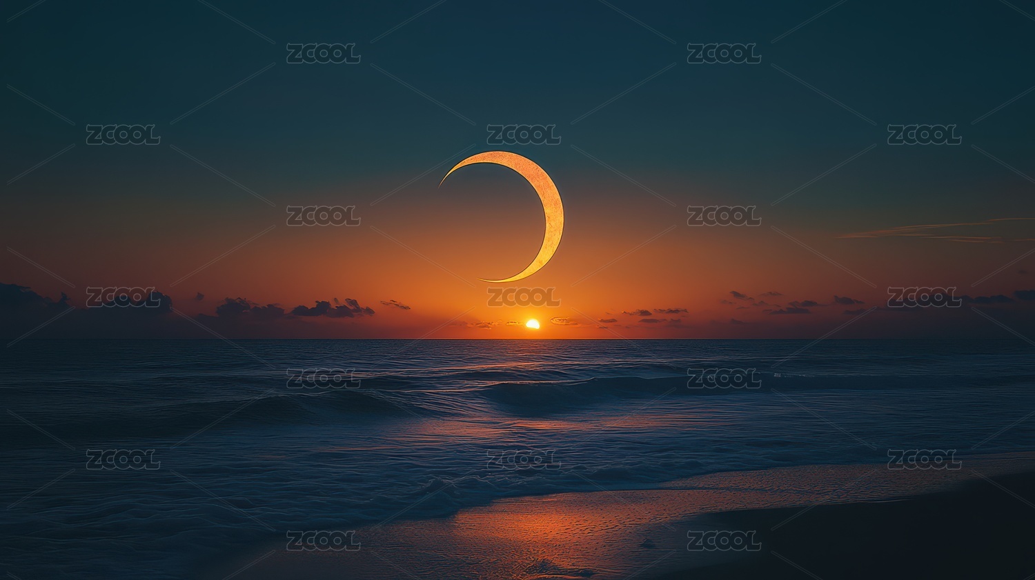 海上日落映照新月的壮丽景象