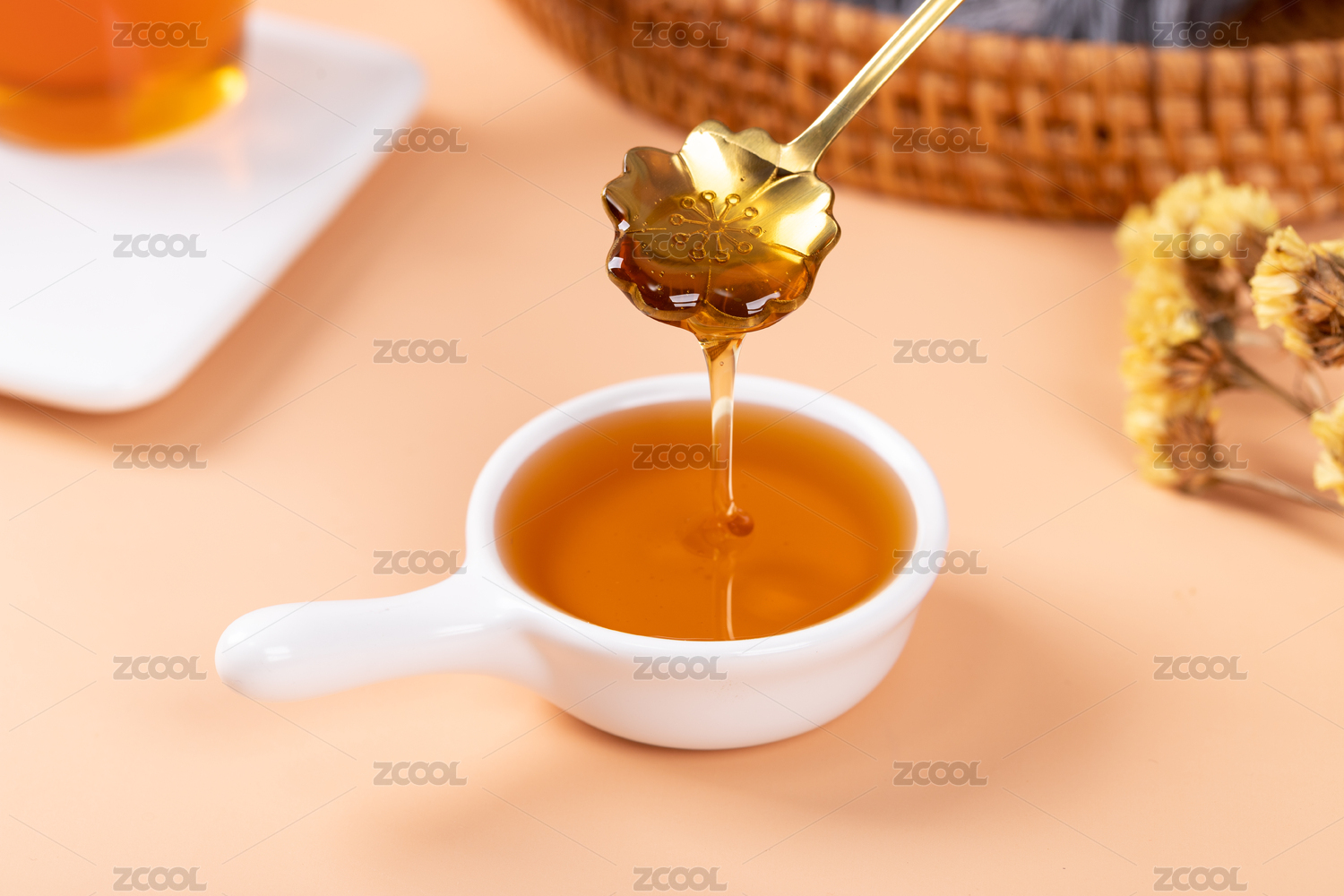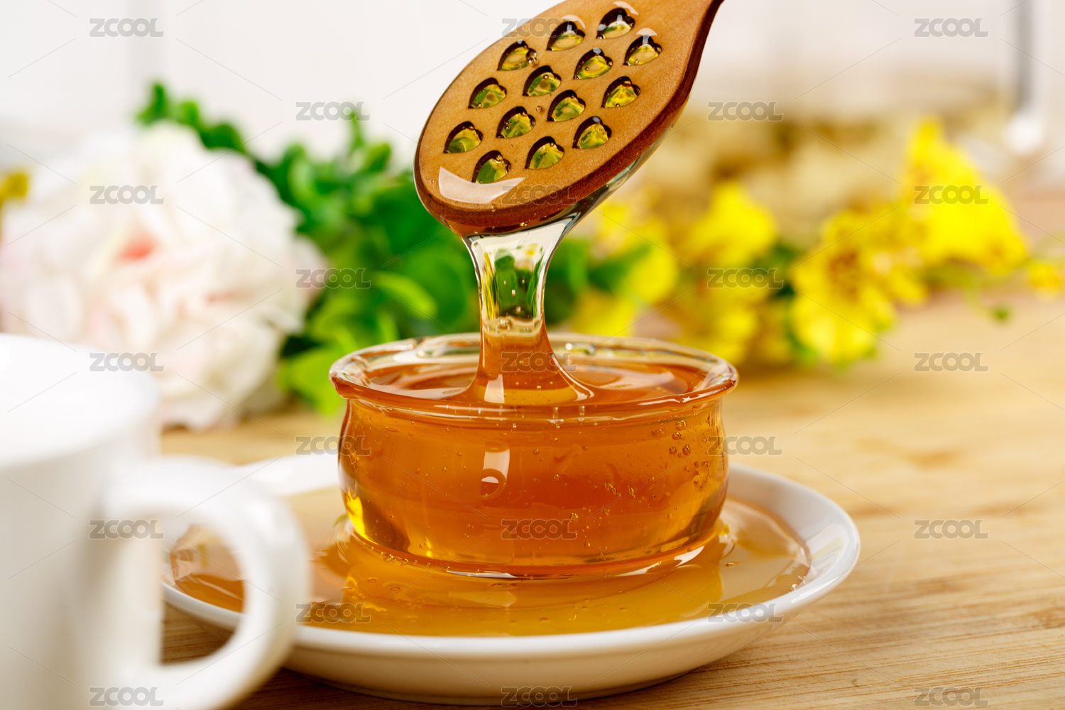 桌面上从蜂蜜搅拌棒向杯子里滴落的蜂蜜