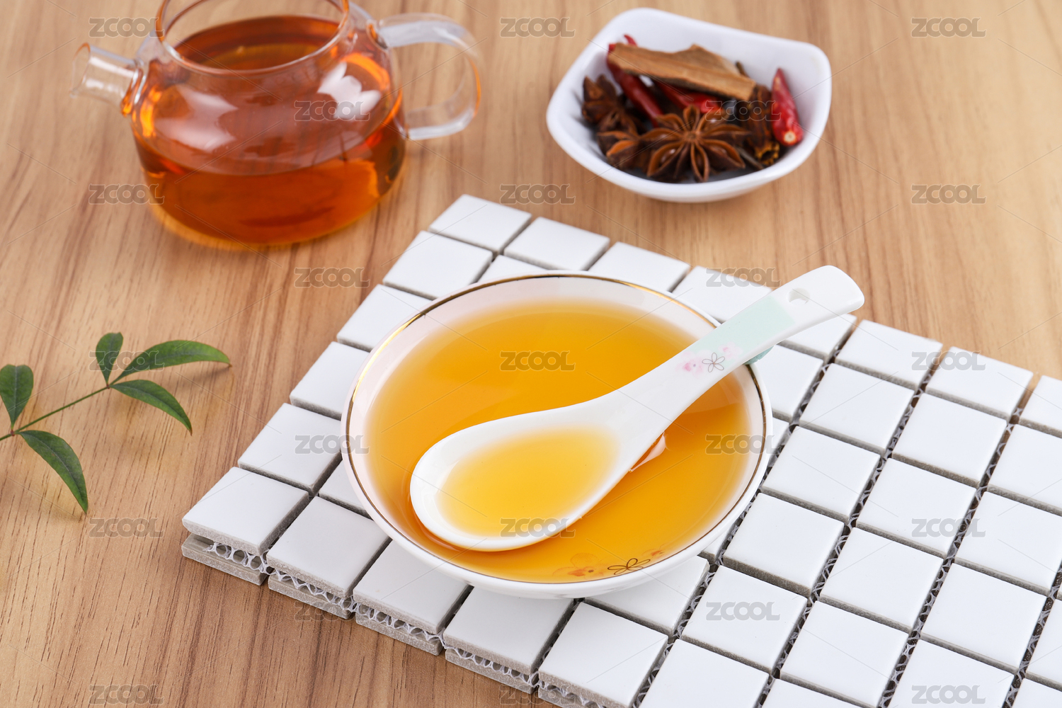 中国风背景木纹桌面上的红茶茶叶和茶水