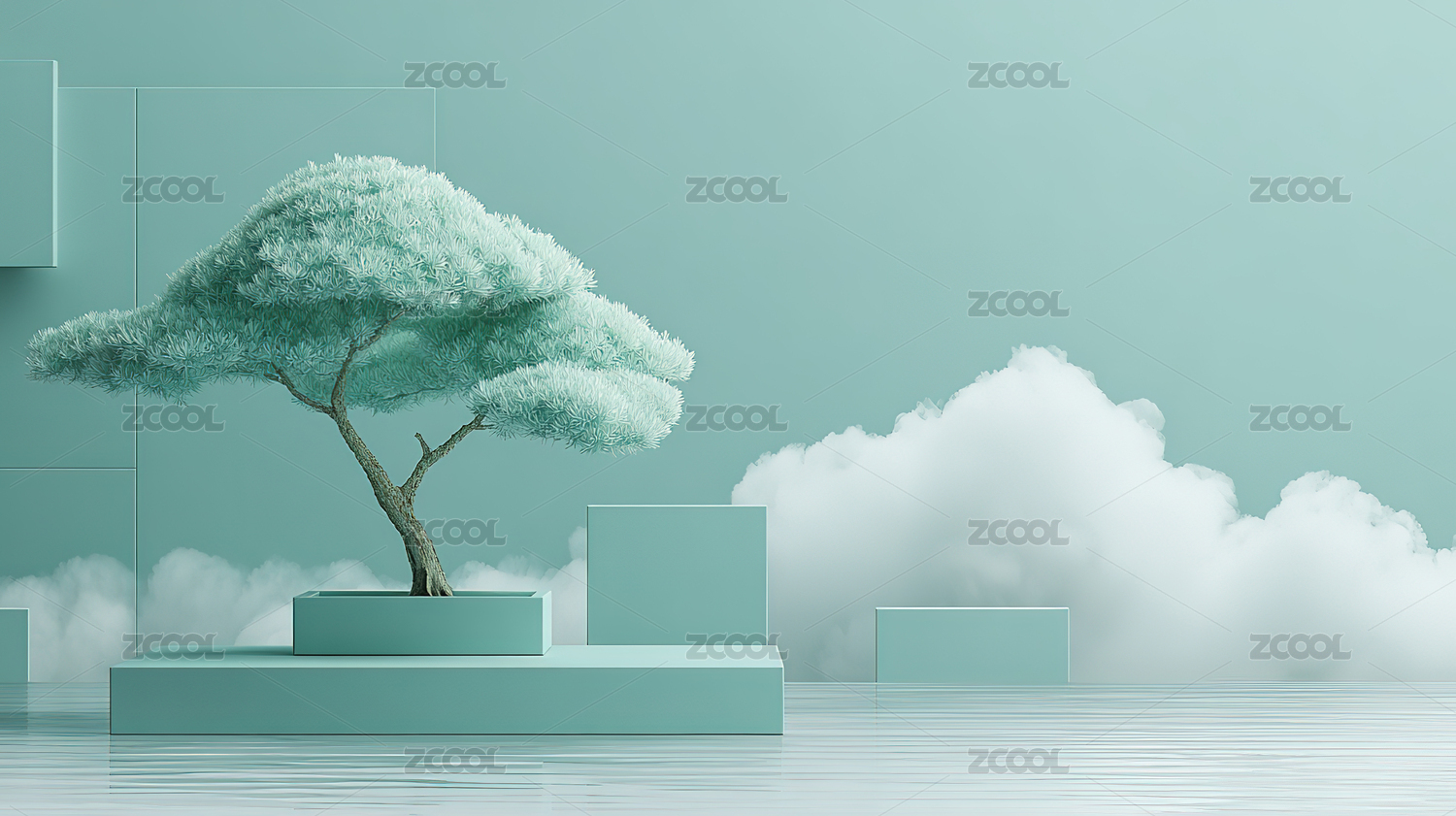 青色盆景树与云雾场景