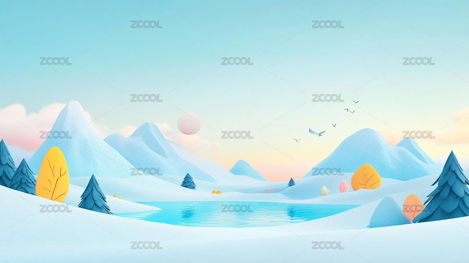 冬天清新明亮下雪的山丘河谷3D卡通背景
