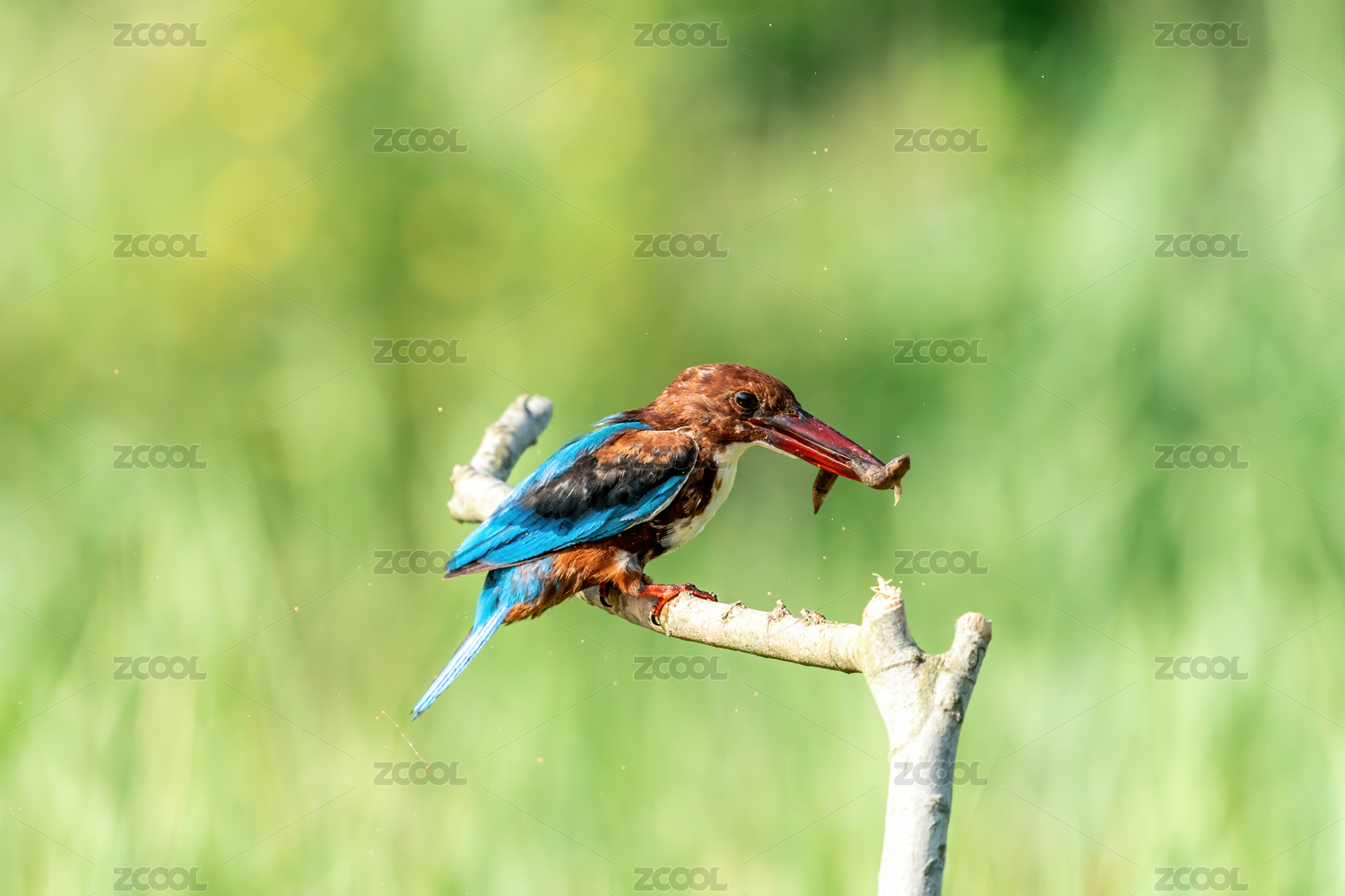 停在树干上嘴里叼着小鱼的蓝翡翠