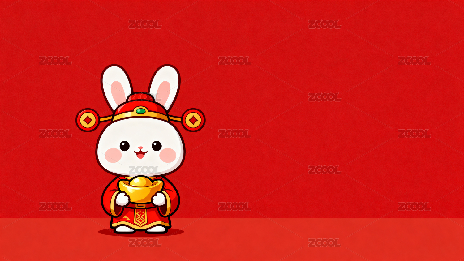 兔年3D兔子丢出金元宝坐在红色屏风前面