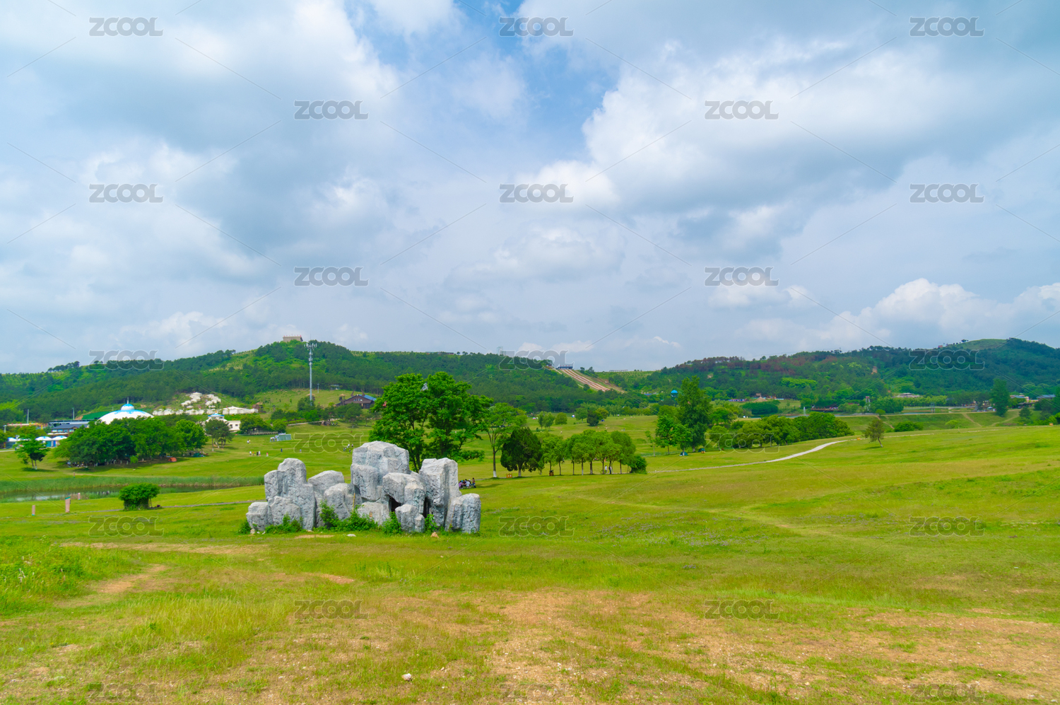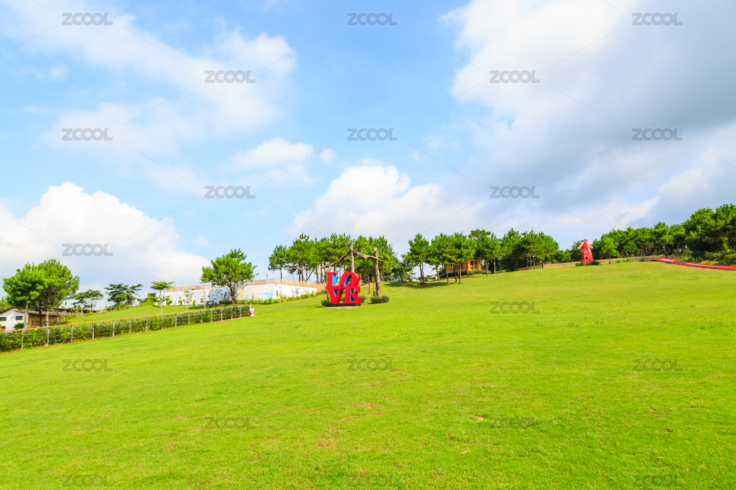 蓝天白云里的绿色草坪