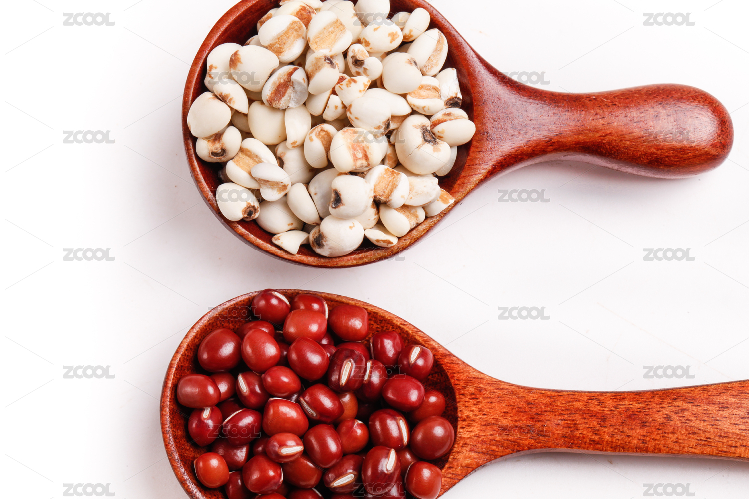 白底上用盘子装的红豆和用勺子装的薏米