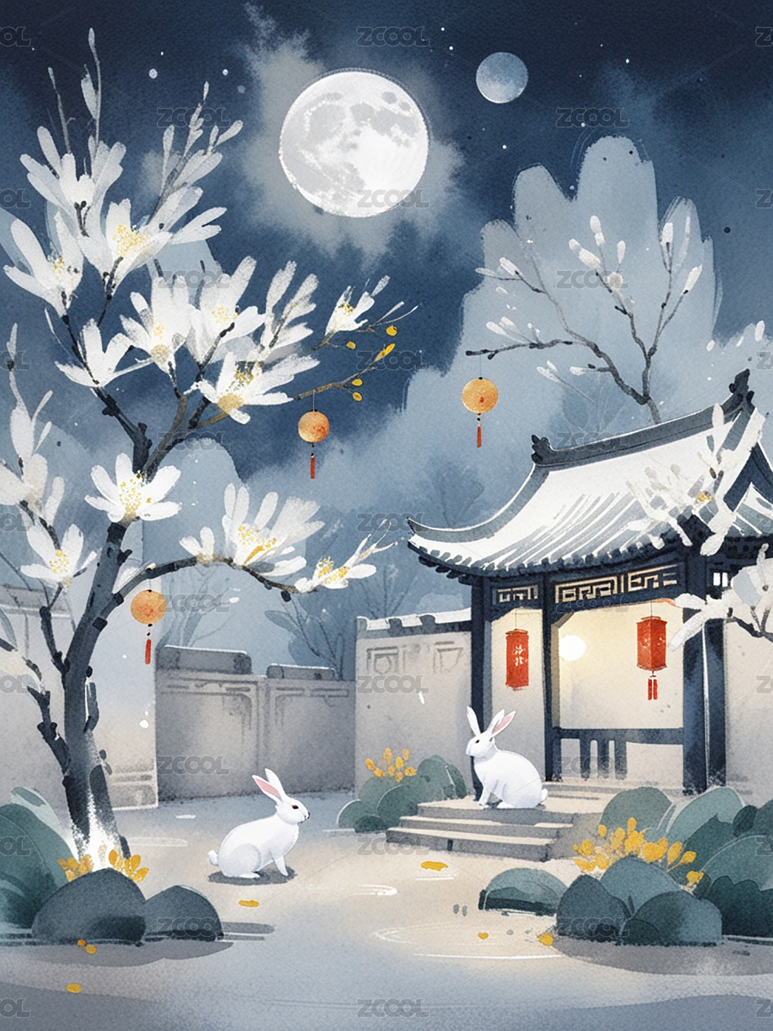 中秋,节日,玉兔,兔子,可爱,月亮,星空,手绘,插画,特写
