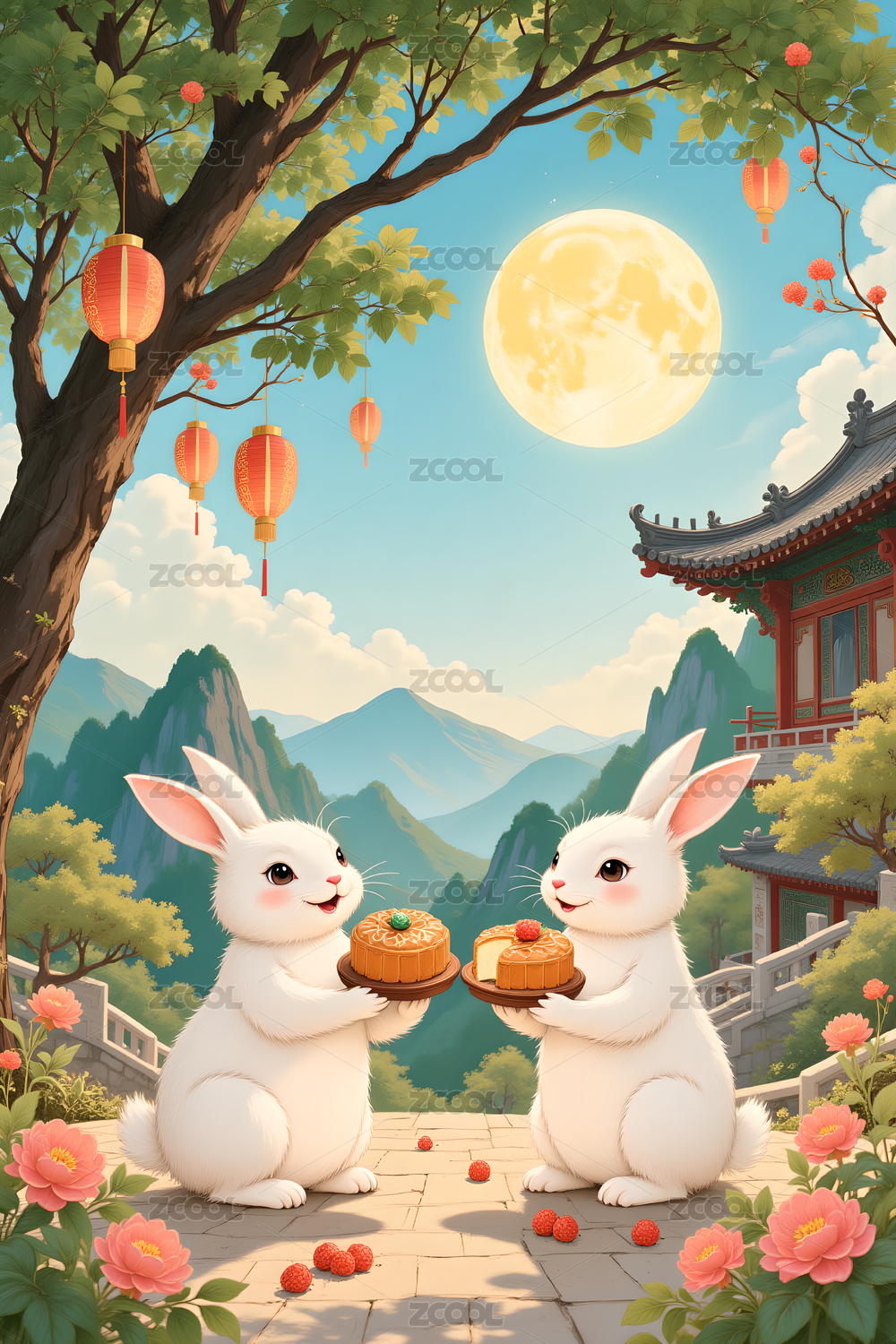 中秋节海报国风插画2只玉兔向月宫呈上月饼