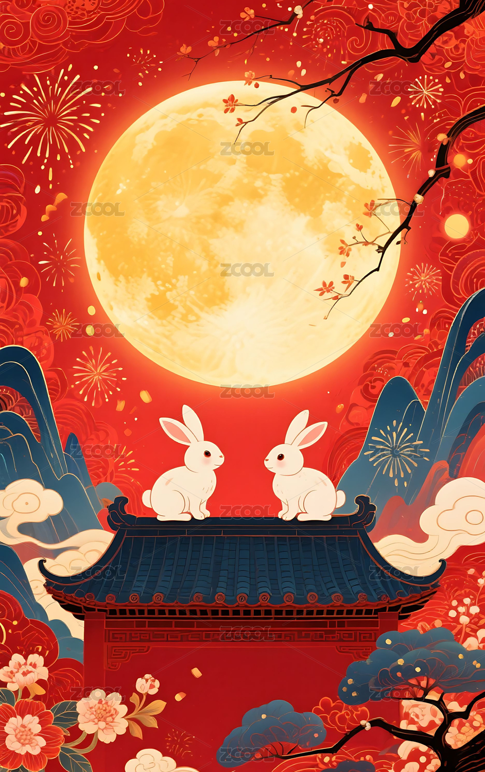 中秋节红色氛围屋顶上的兔子和圆月插画背景