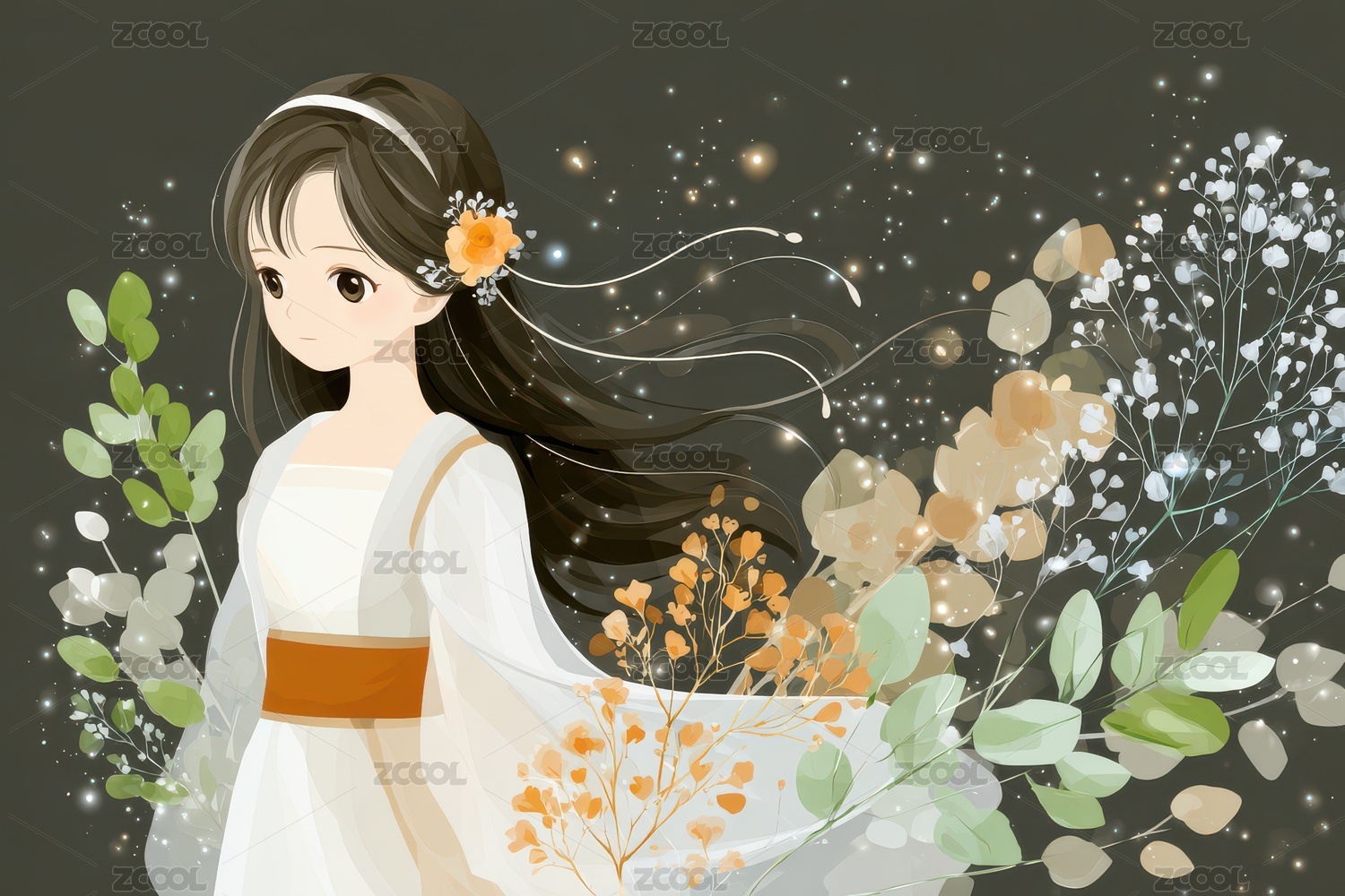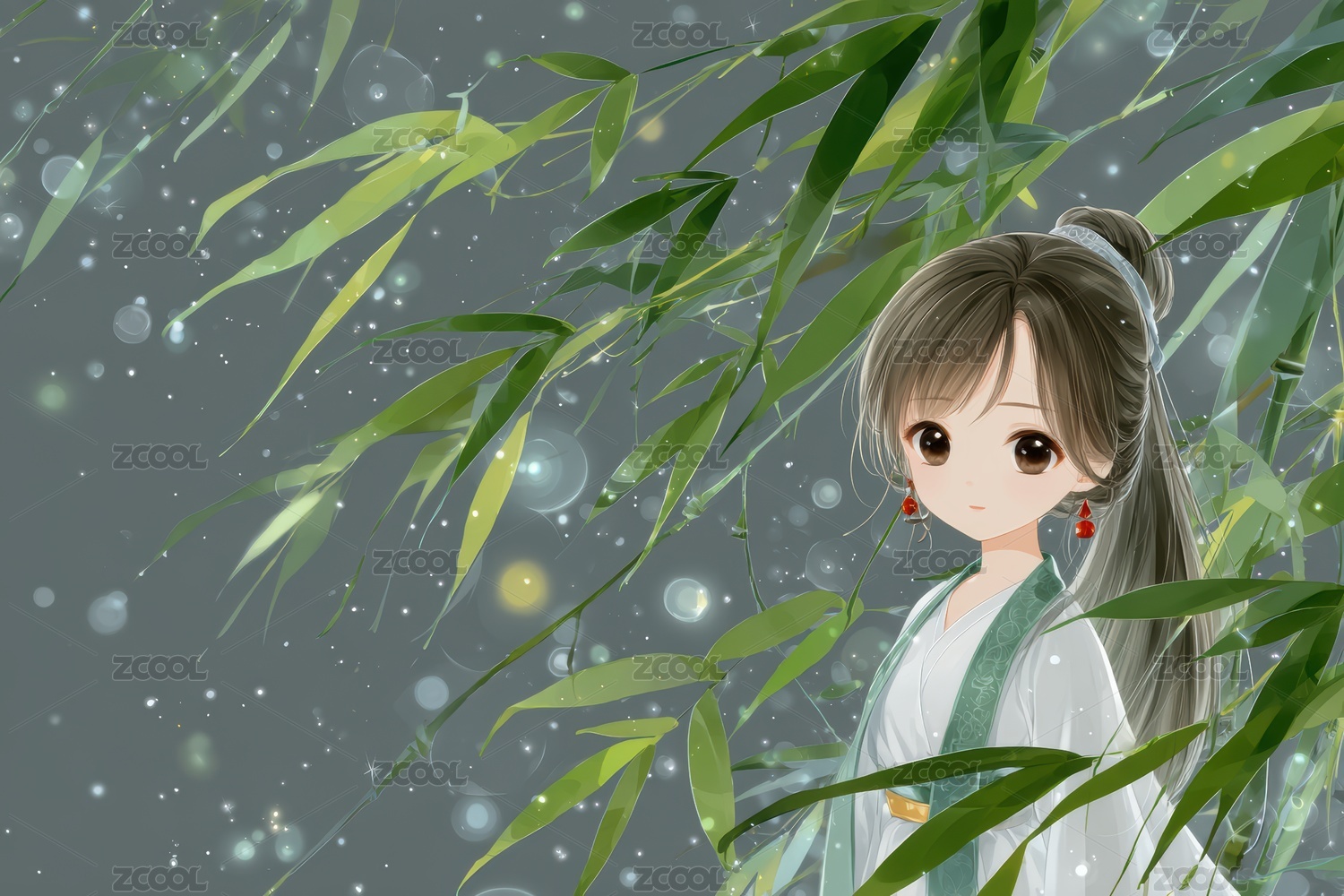 绿色唯美卡通夏季公园里悠闲惬意的少女插画