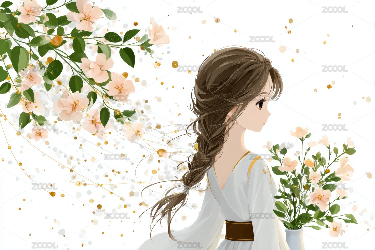 女子闭眼嗅花香粉色唯美春季女性节日插画