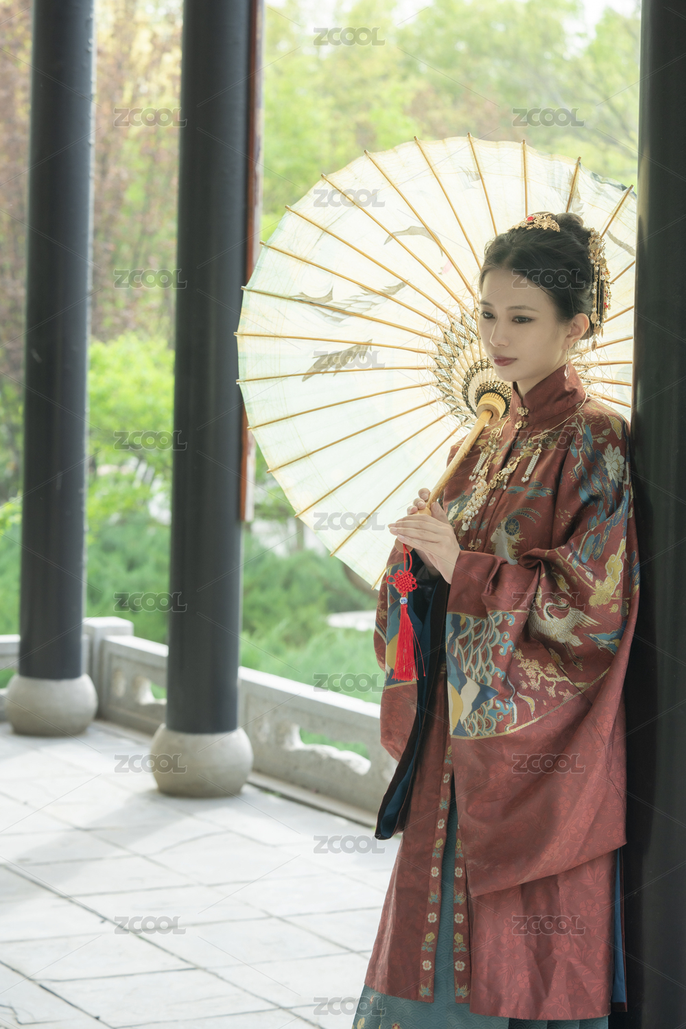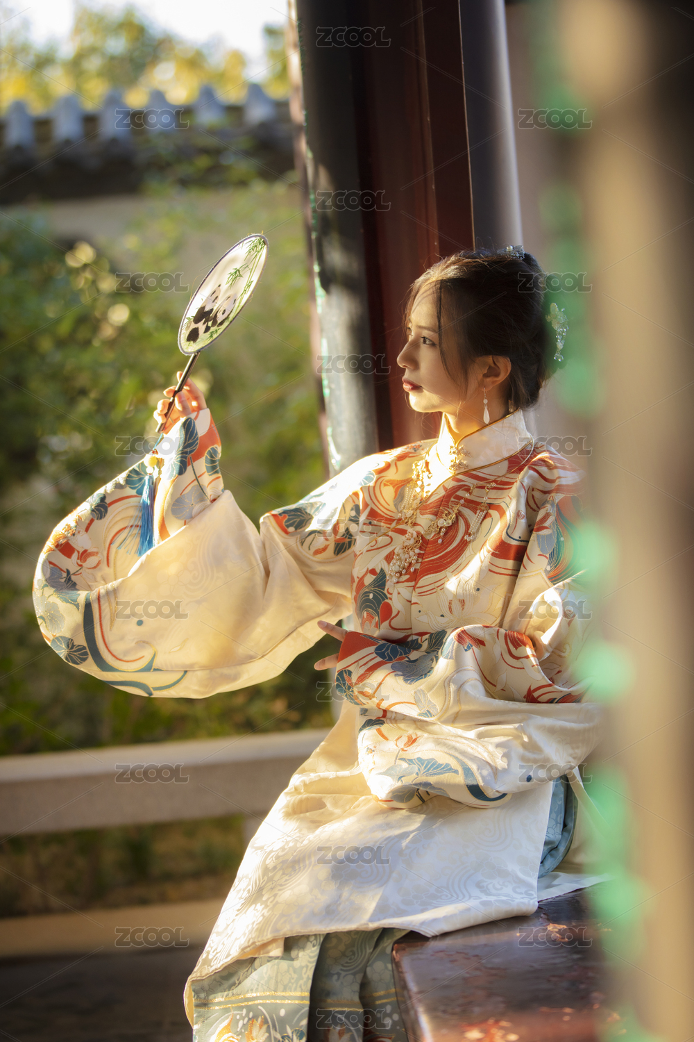 身穿汉服的女孩手持蒲扇在窗台前静思