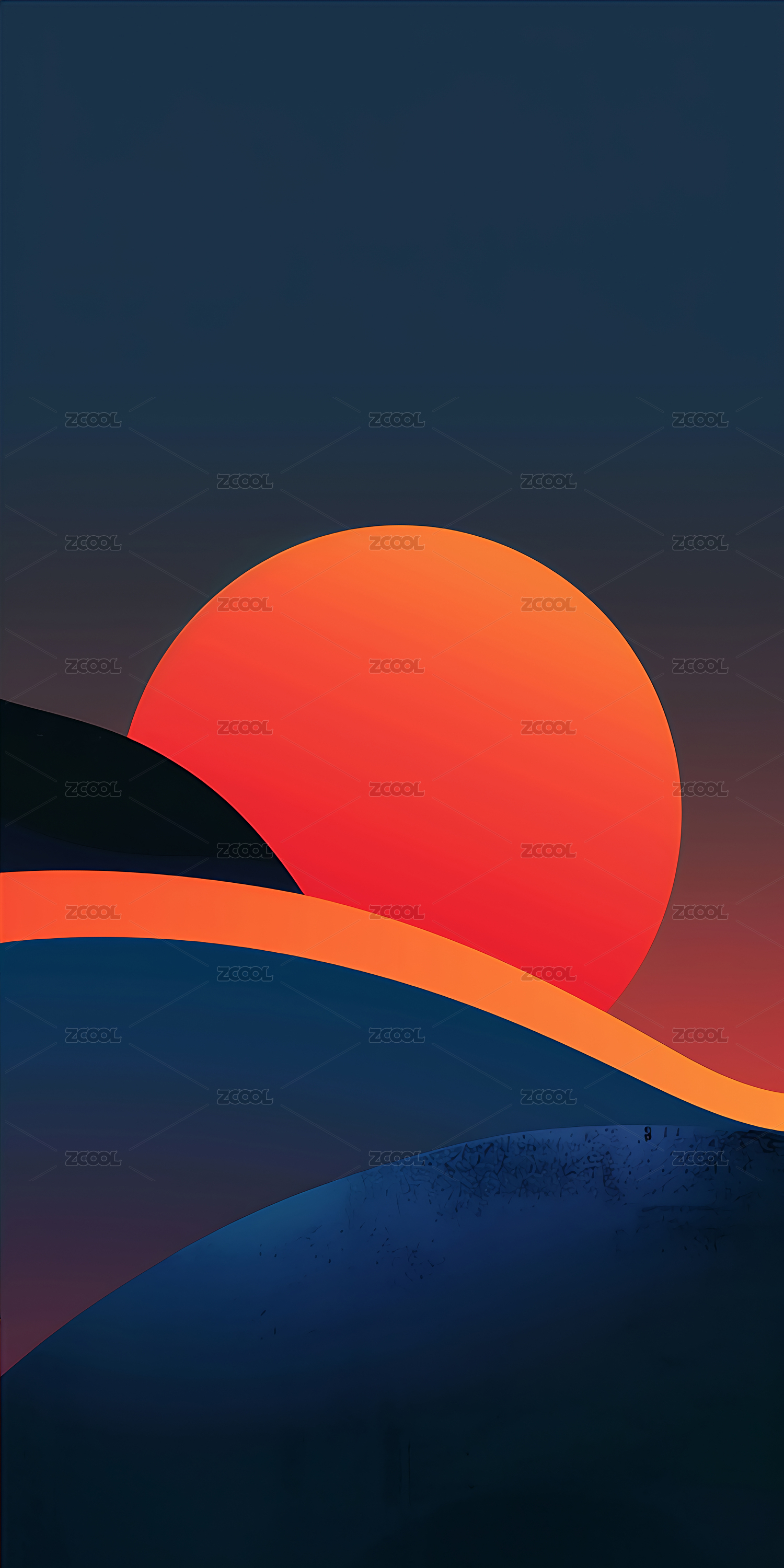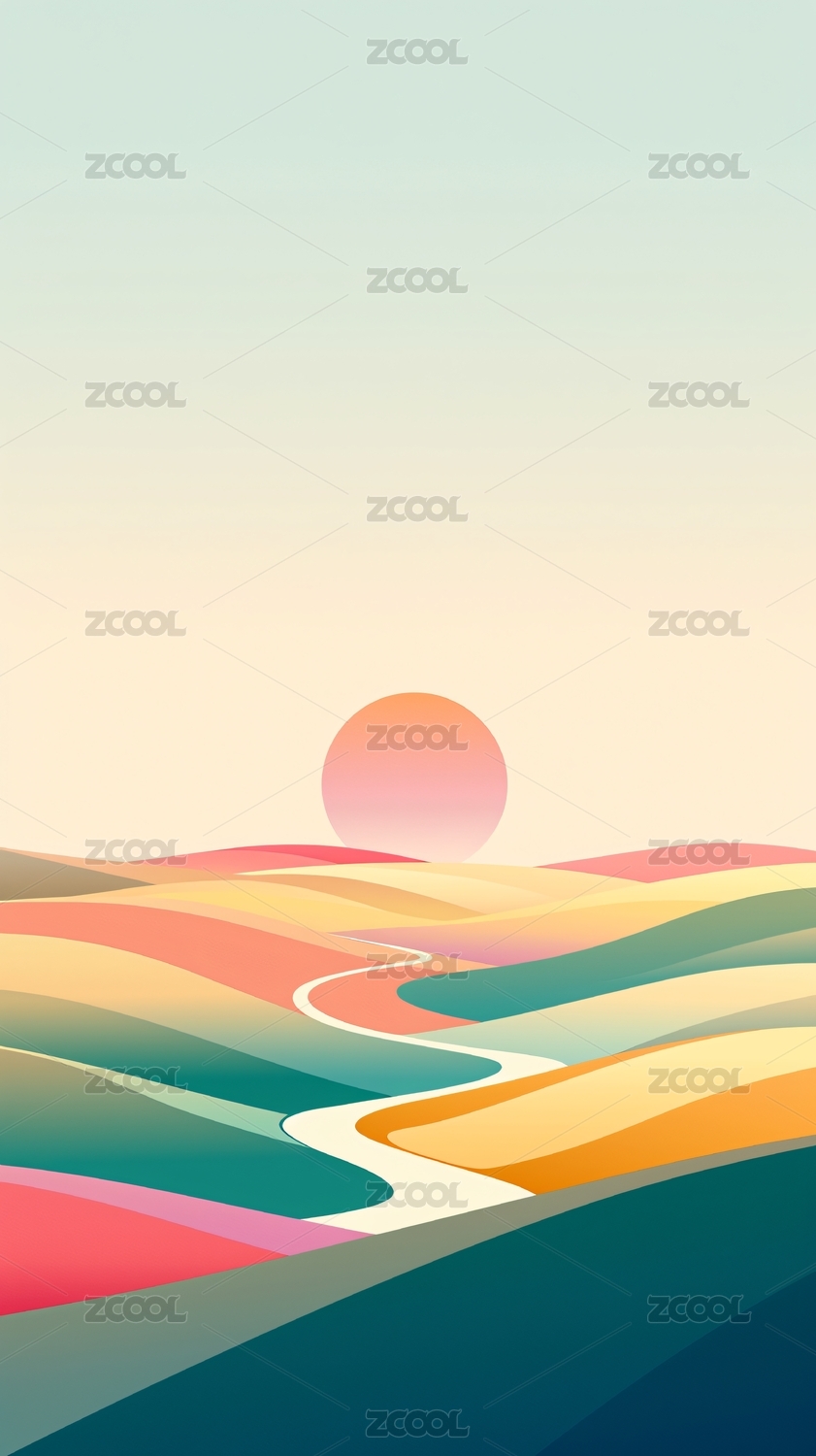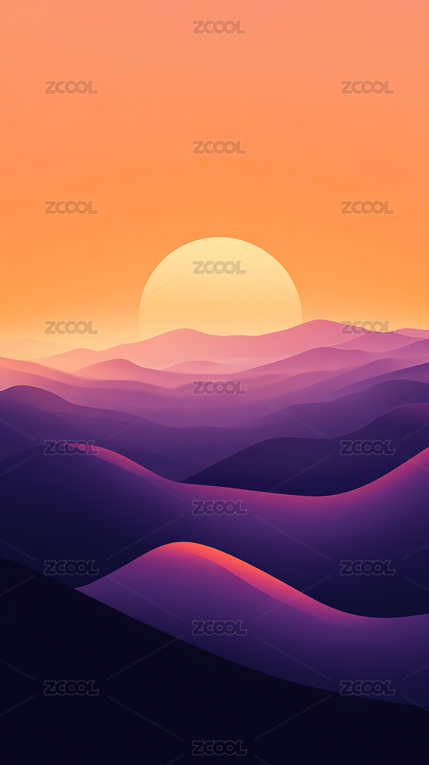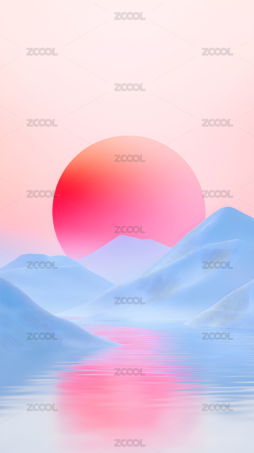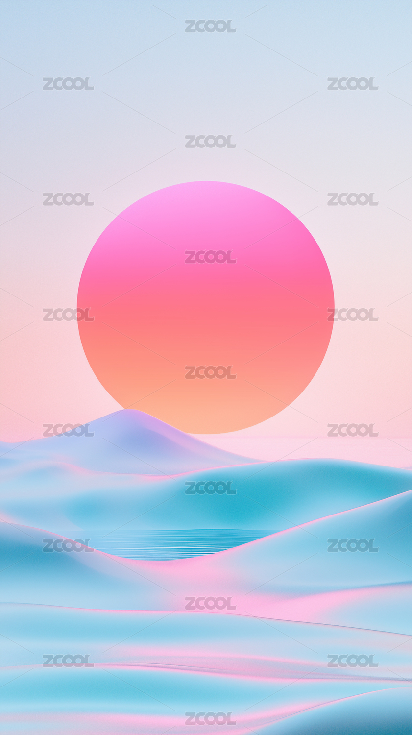 巨大的圆形太阳悬挂在渐变的粉色和紫色天空