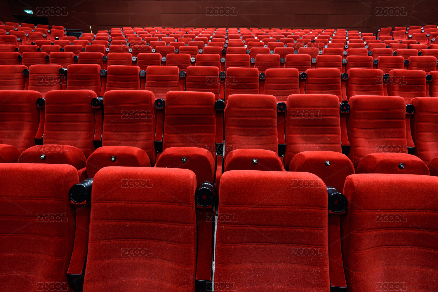 无人的大型的电影放映厅,红色的椅子