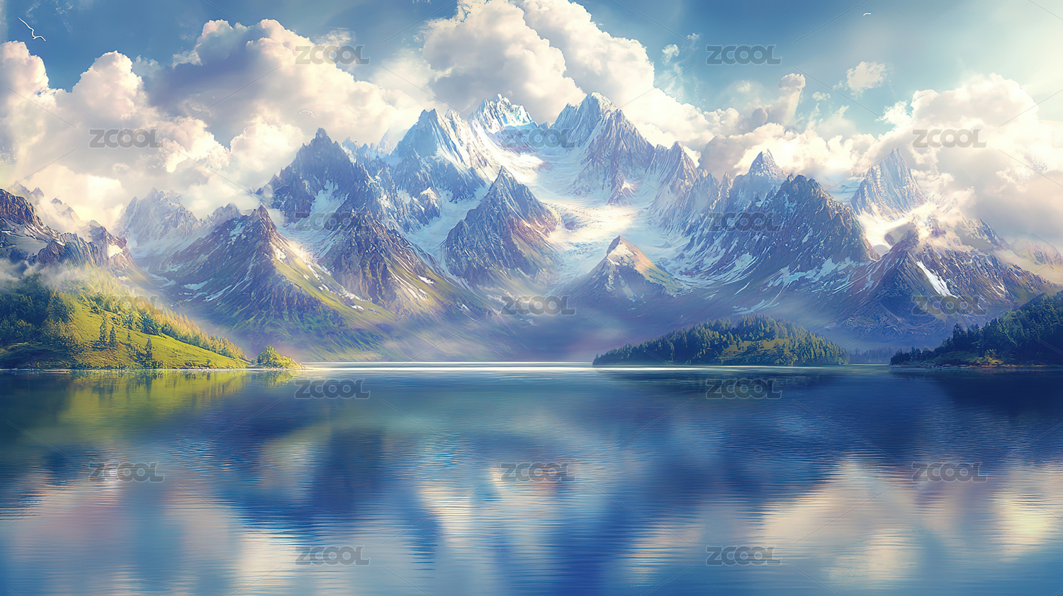 雪山湖泊草原风景画