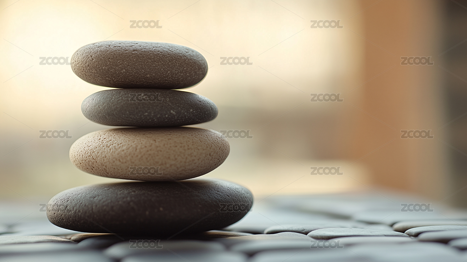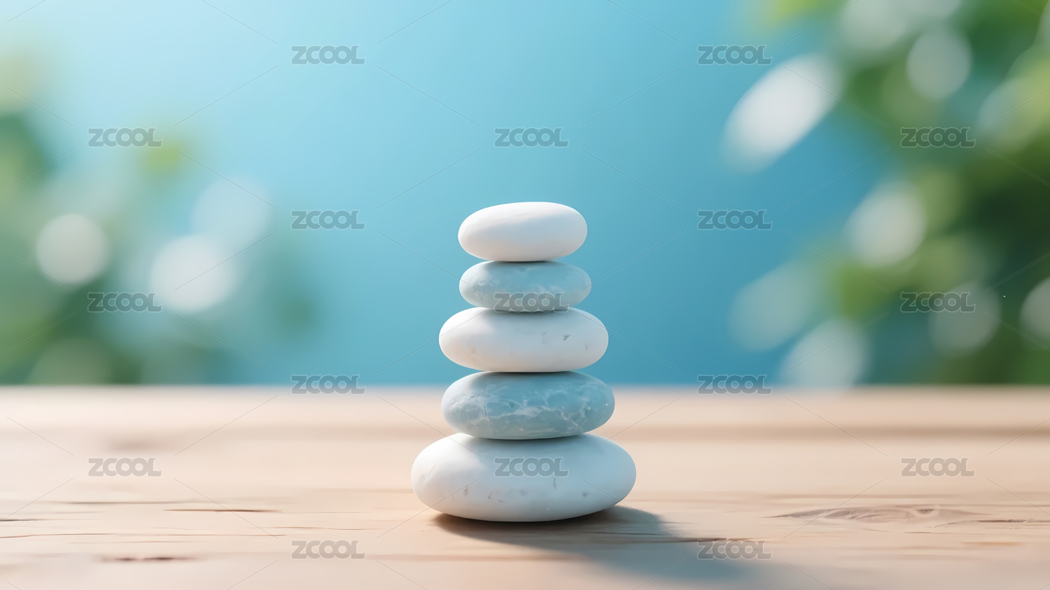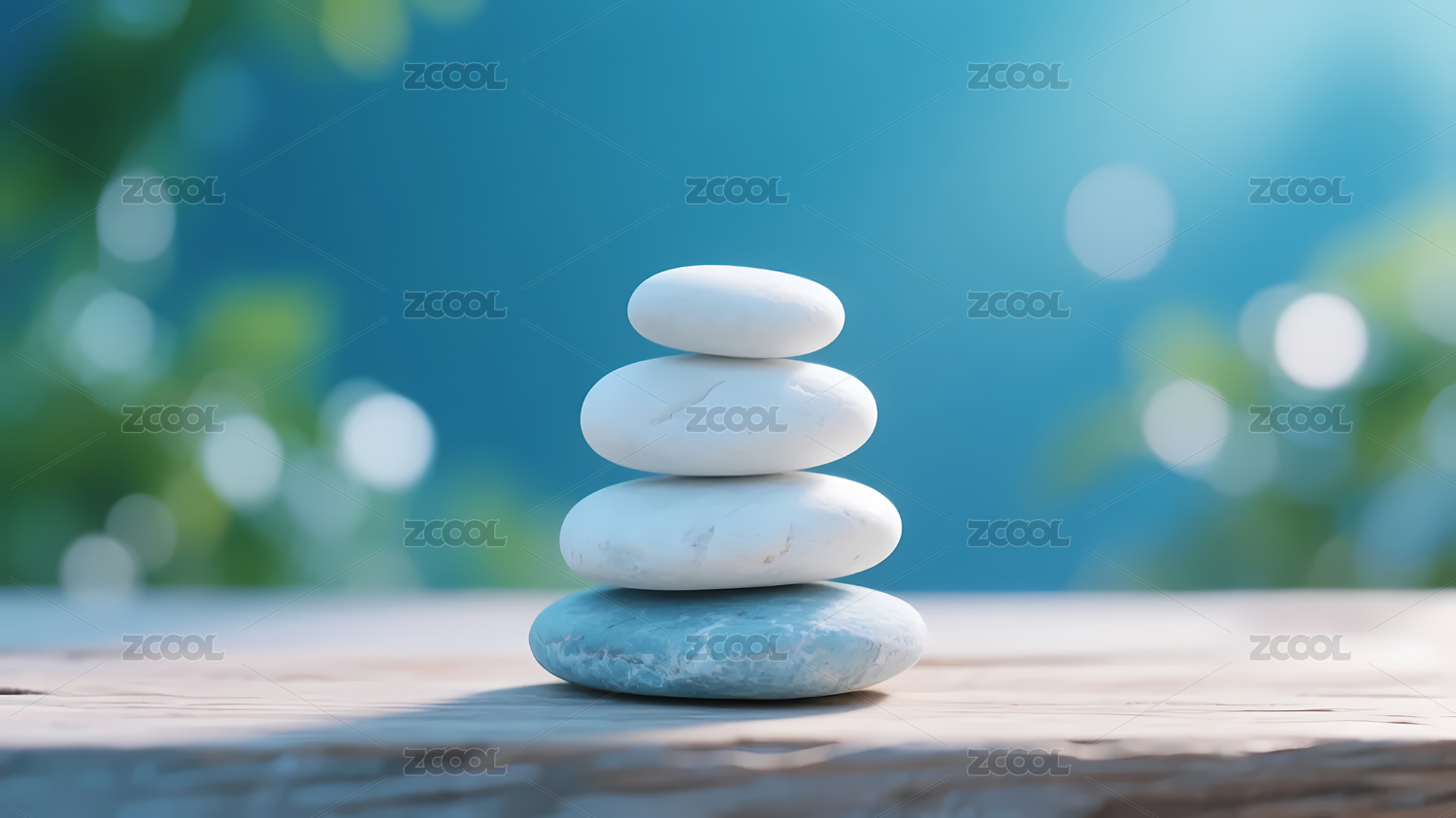 三个鹅卵石平稳的叠放在桌子的木板上,背景虚化