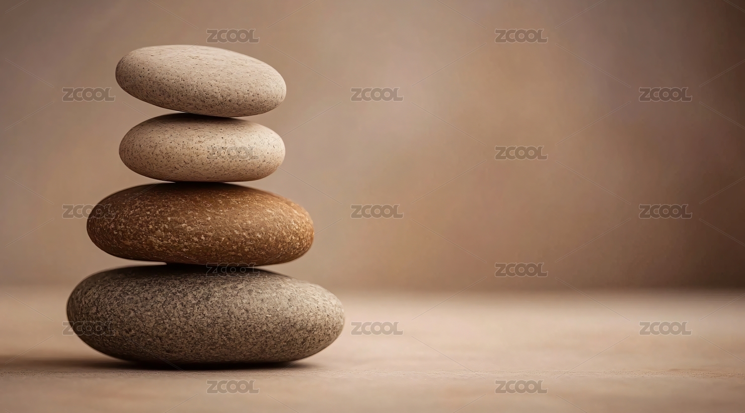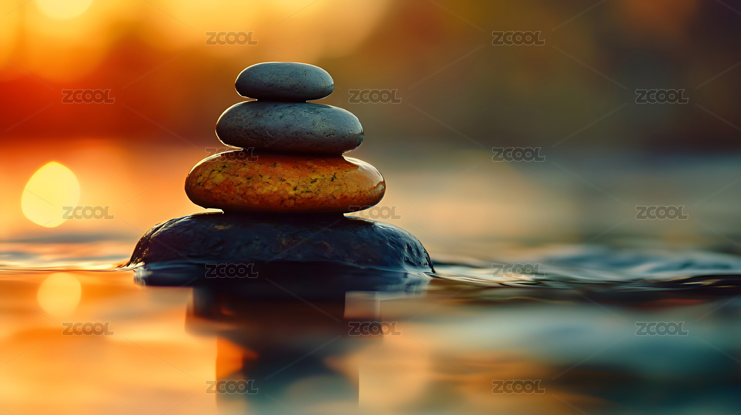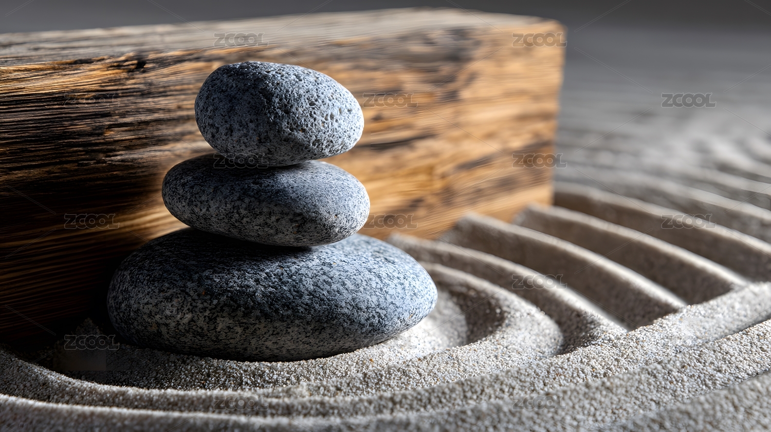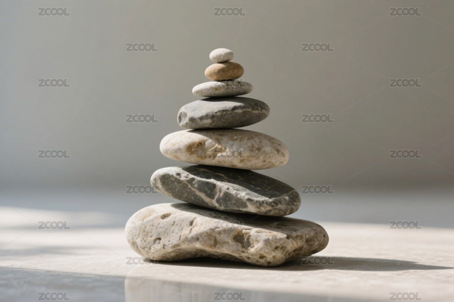 三个鹅卵石平稳的叠放在桌子的木板上,背景虚化