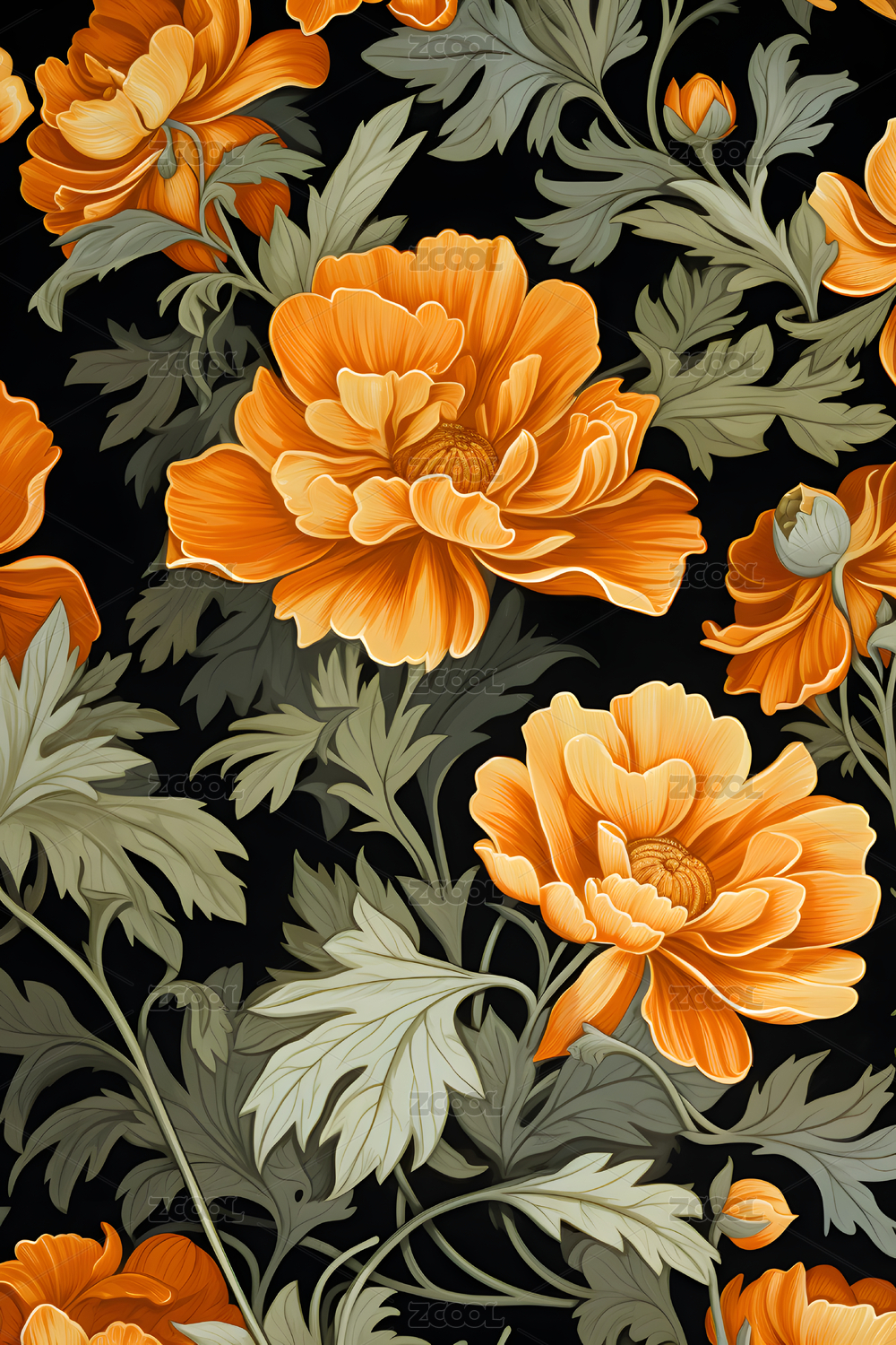 橙色郁金香与深色背景的花卉图案