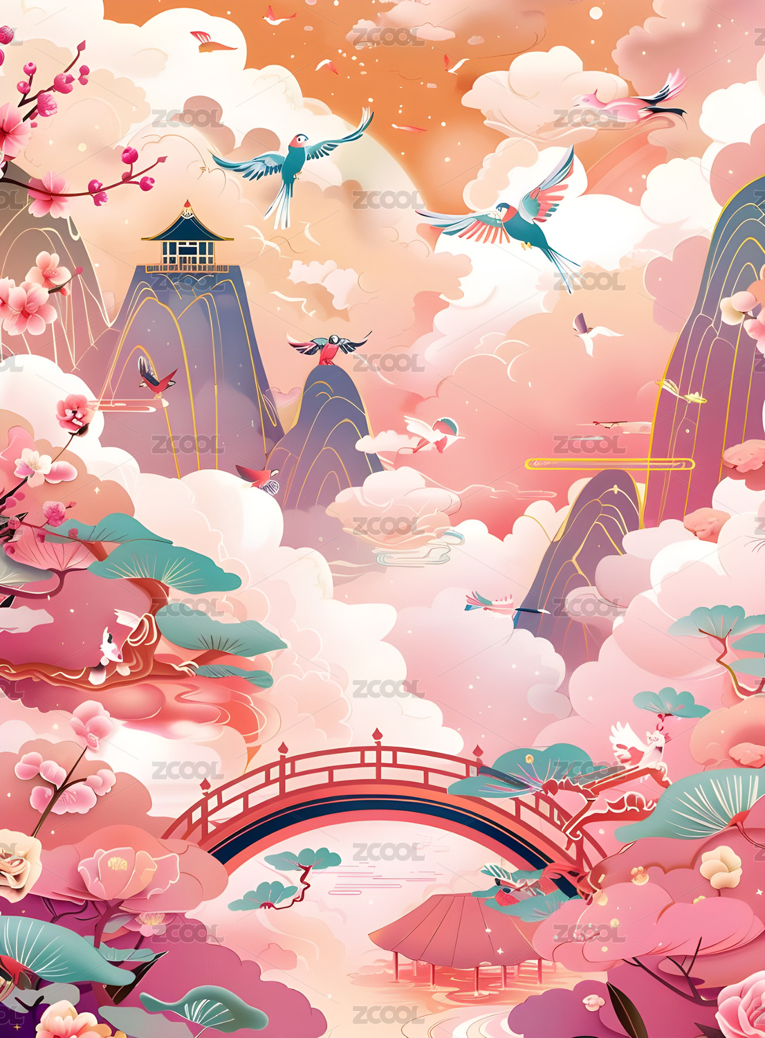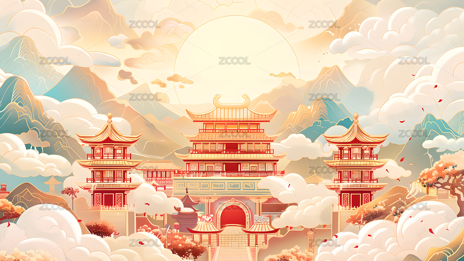 国潮风格中式宫殿塔楼古代建筑物国风古风